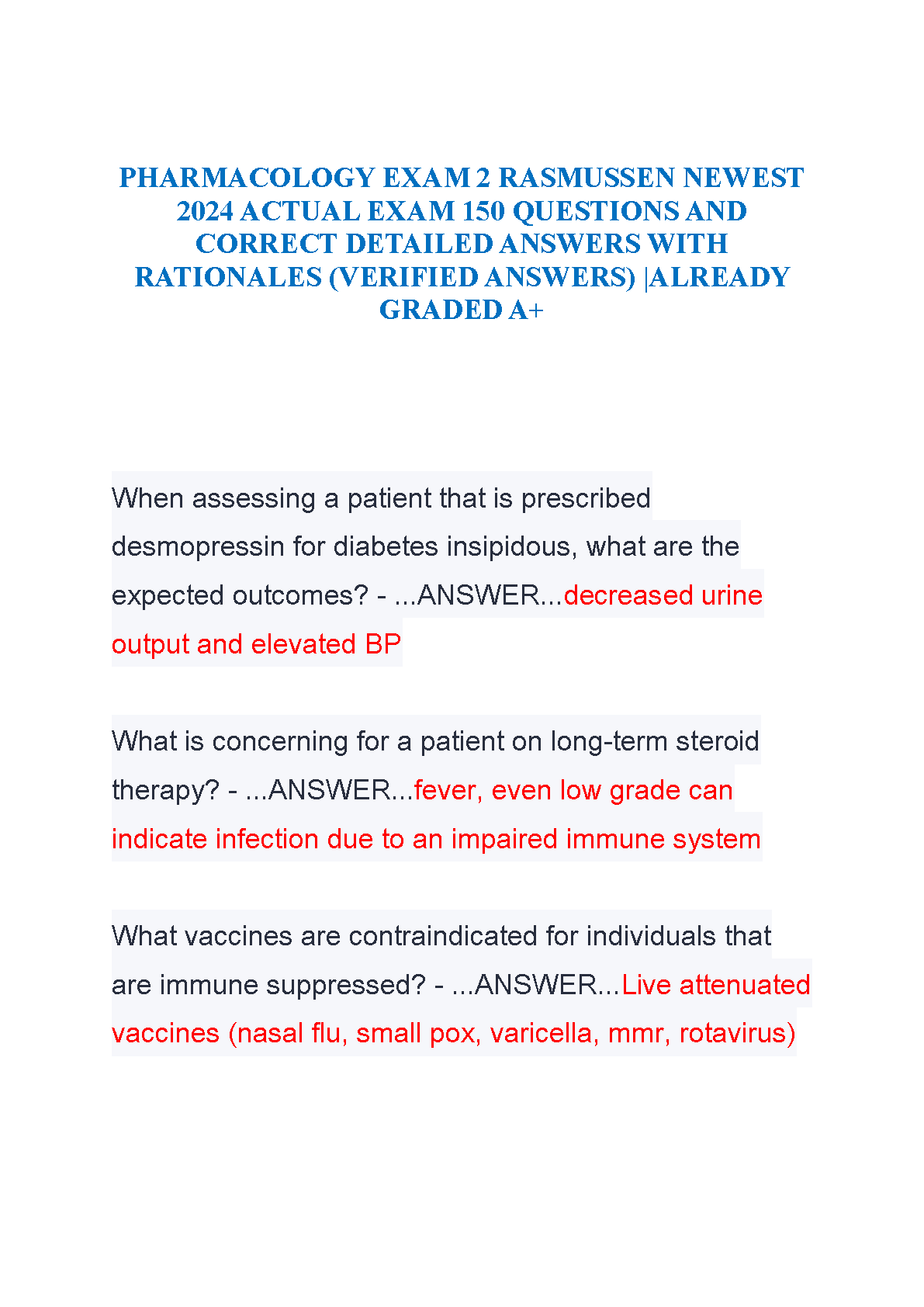 Unlock success in your Rasmussen Pharmacology Exam 2 with this newly updated 2024/2025 test bank. This essential study guide contains 150 meticulously compiled questions directly from the actual exam, complete with verified answers and detailed rationales for each. It's designed to provide a deep understanding of core pharmacology principles, ensuring you're fully prepared to not only pass but achieve an A+ grade. Get the confidence you need to excel in your nursing studies and master pharmacology concepts effectively.