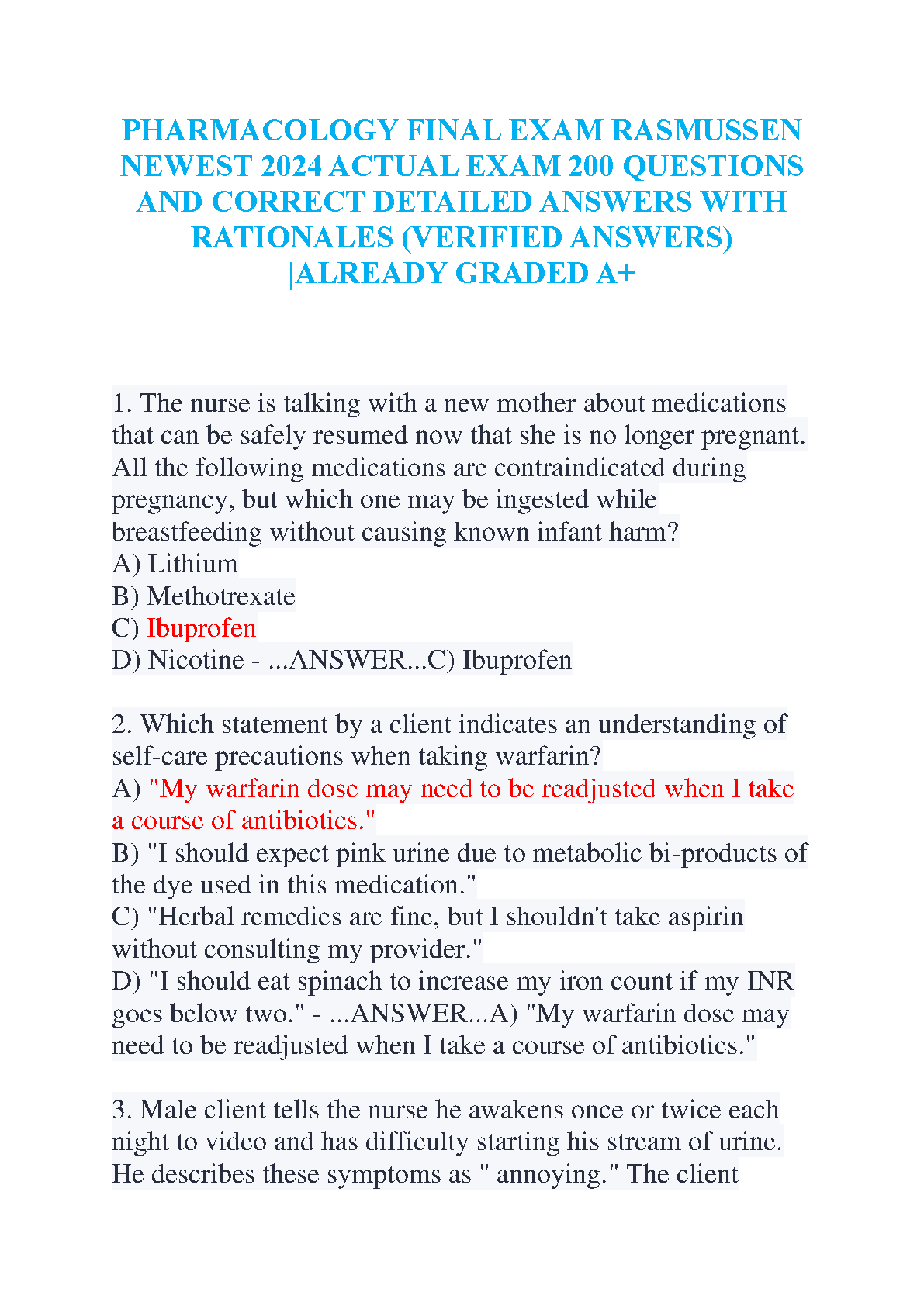 Ace your Rasmussen University Pharmacology Final Exam with our definitive 2024 test bank. This comprehensive guide is packed with 200 actual exam questions, each accompanied by verified, correct answers and detailed rationales to ensure you master the material. Specifically tailored for nursing students, this A+ graded resource is your key to understanding complex concepts and passing your final exam with confidence. Prepare effectively and achieve top scores with this essential study tool.