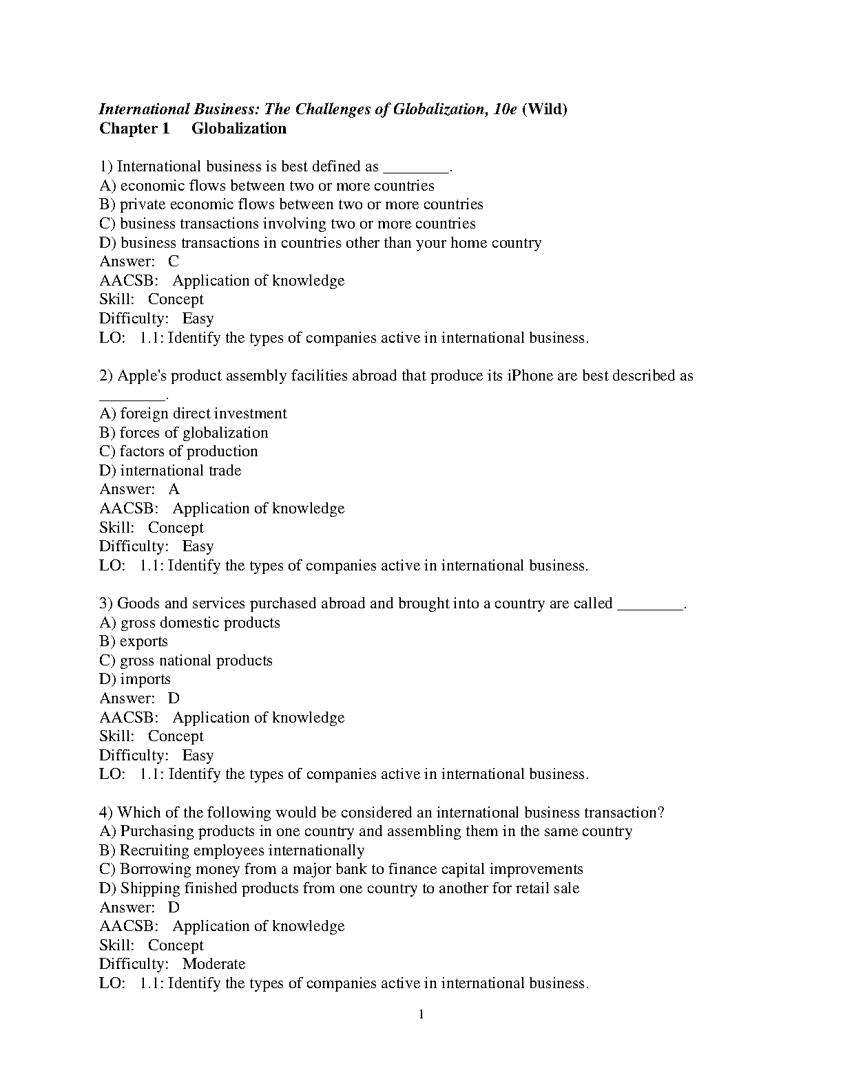 Unlock your full potential and excel in your studies with the complete Test Bank for International Business: The Challenges of Globalization, 10th Edition by John J. Wild and Kenneth L. Wild. This essential study guide provides a comprehensive collection of exam-style questions, including multiple-choice, true/false, and essay prompts, meticulously organized by chapter. Each question is accompanied by a correct answer and detailed rationale, ensuring you grasp key concepts and are fully prepared for your exams. Download now to gain the competitive edge needed to ace your course and improve your grades.