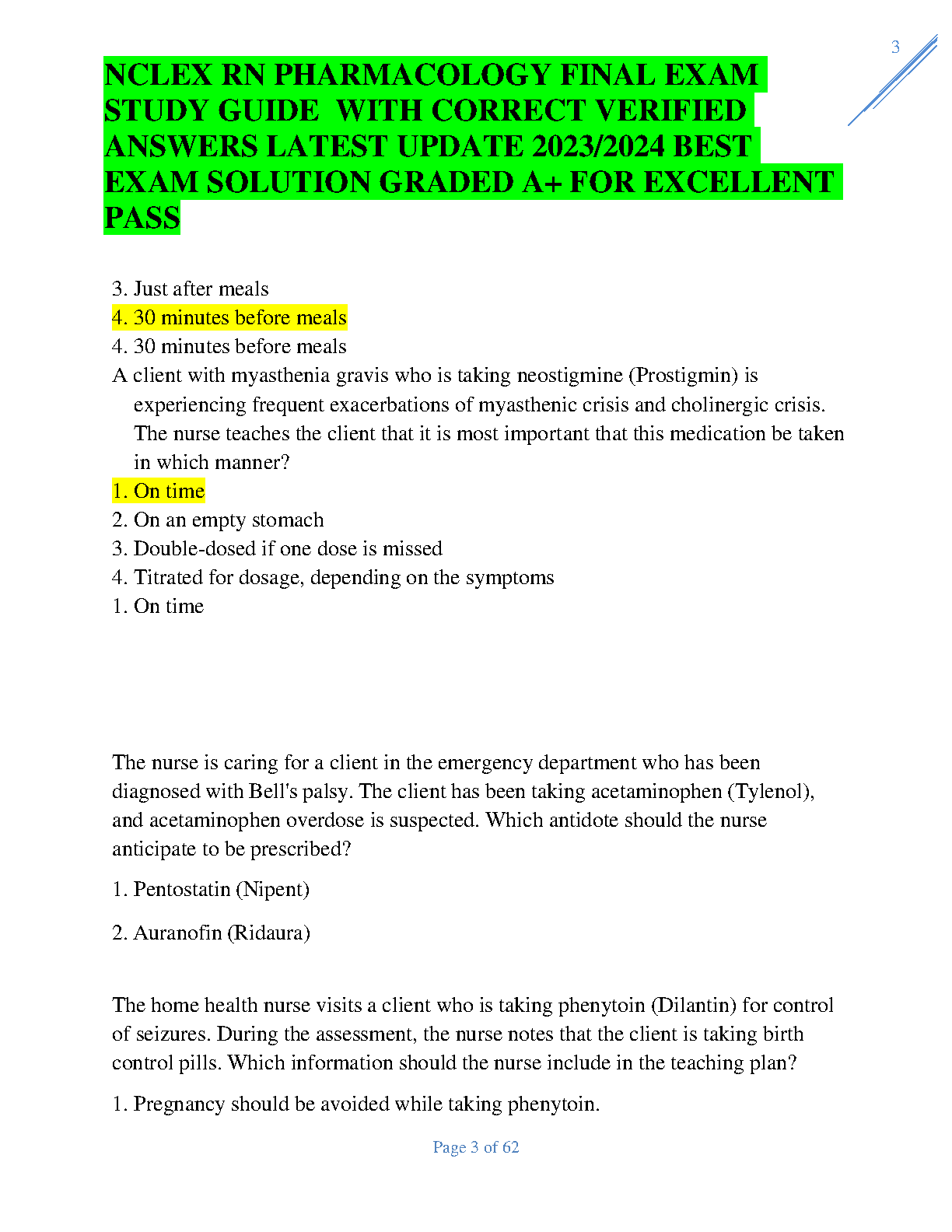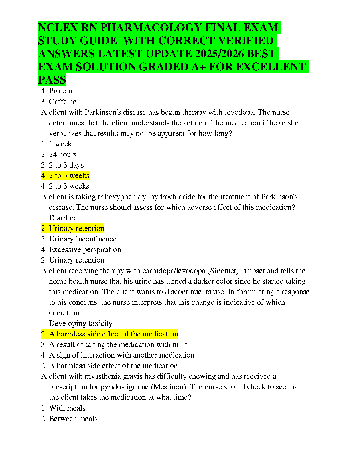 Excel in your nursing career by conquering the NCLEX RN Pharmacology final exam on your very first attempt! This comprehensive 2025/2026 study guide is your ultimate tool for success. Inside, you'll find an extensive collection of exam-style questions paired with correct, verified answers. This A+ graded resource is meticulously updated for the current academic year, ensuring you study the most relevant material. Build your confidence, master complex concepts, and walk into your exam prepared to pass with excellence, avoiding costly resits.