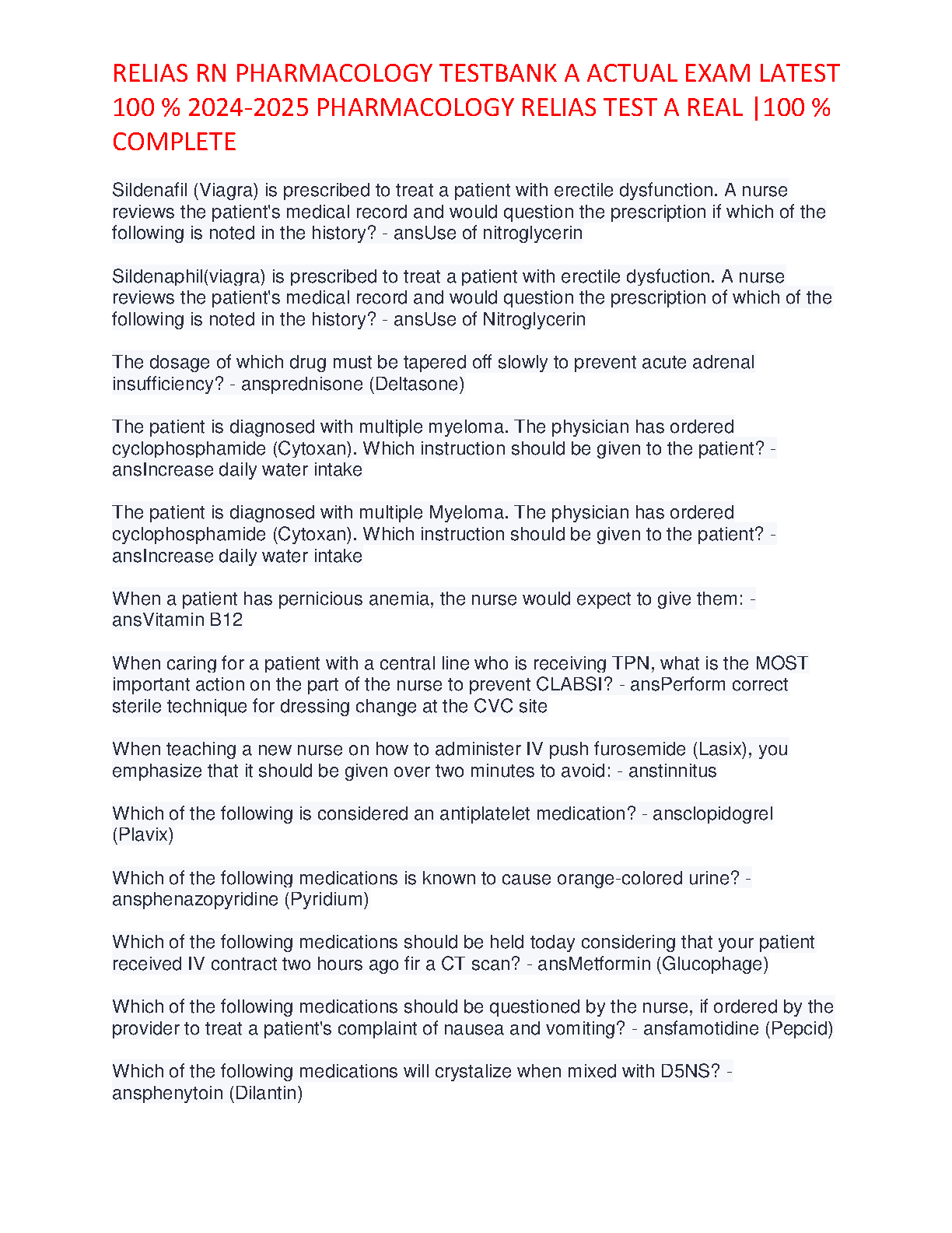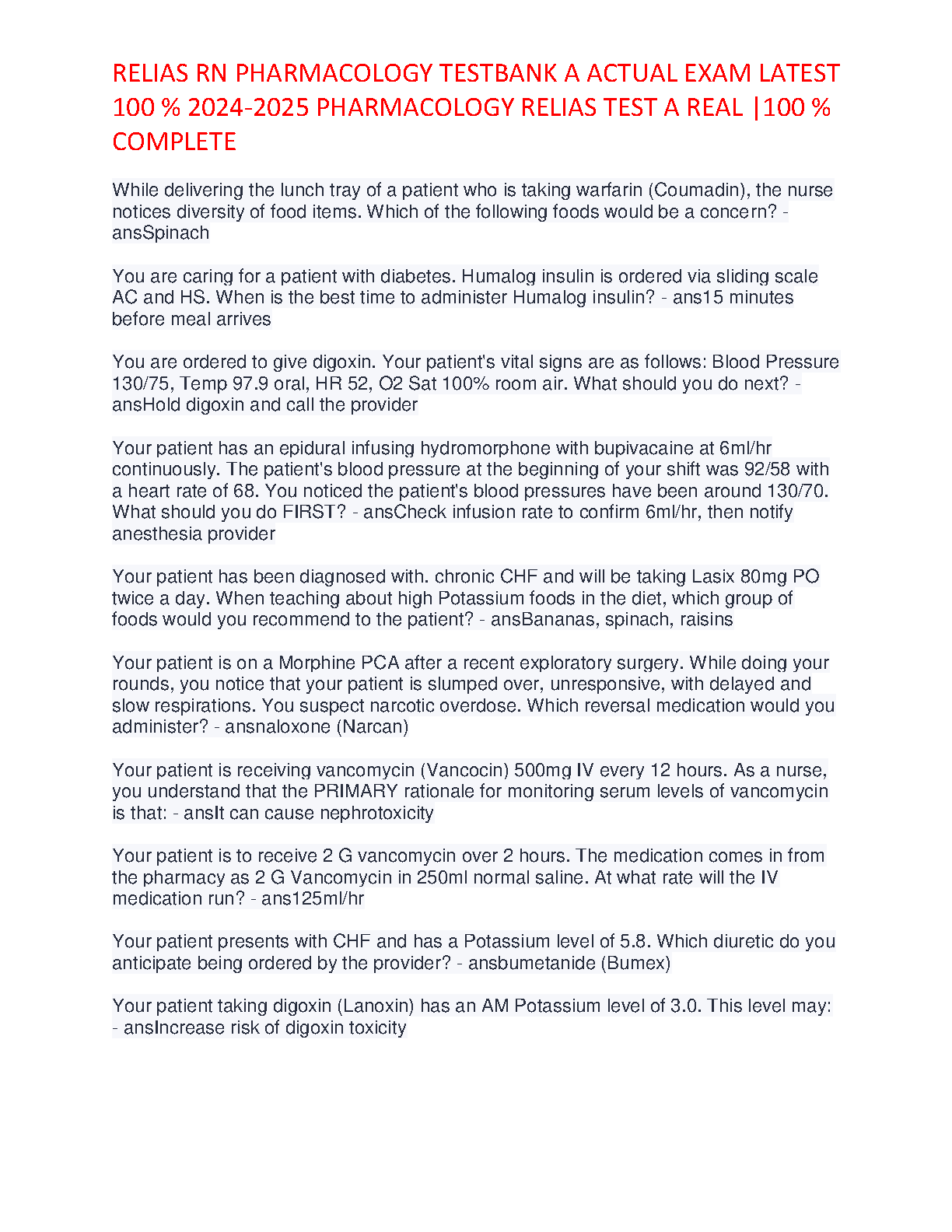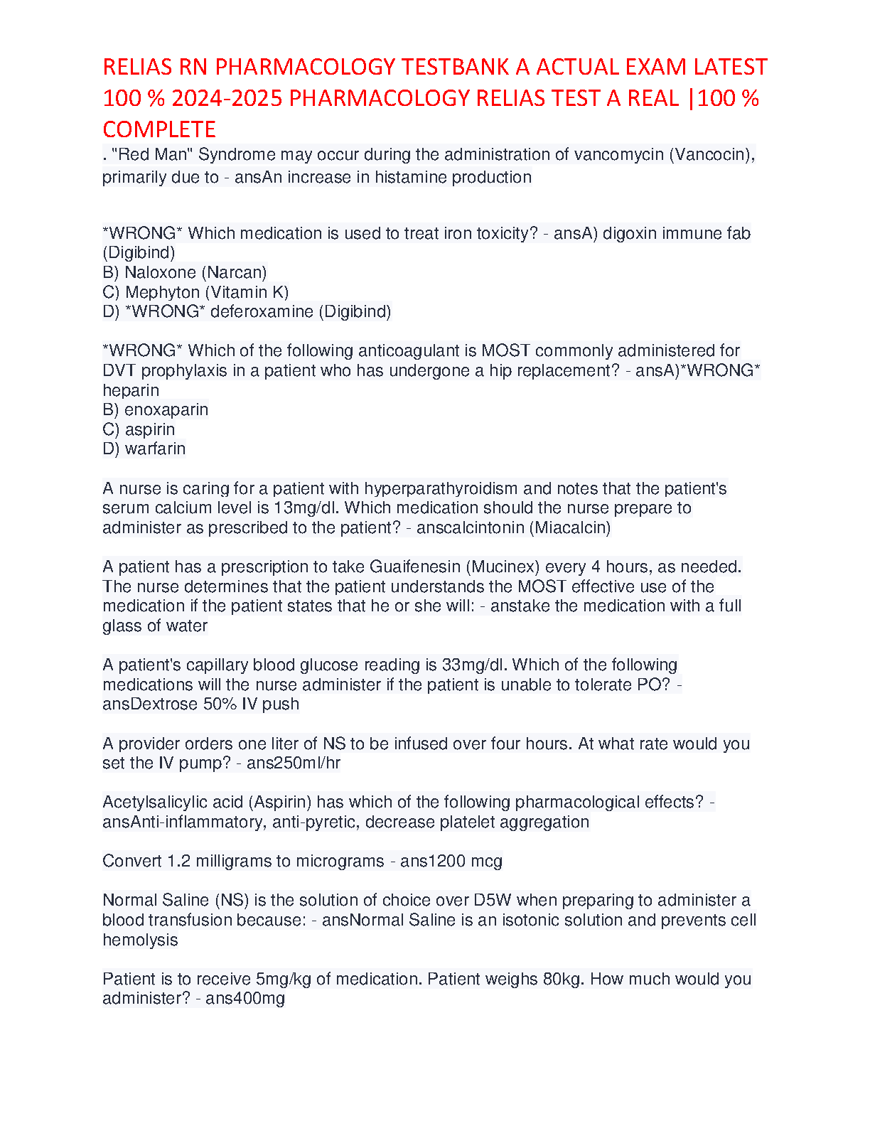 Ace your nursing pharmacology exam with the latest 2024-2025 Relias RN Pharmacology Test Bank. This comprehensive resource is packed with authentic exam questions and verified answers, covering everything you need to know. Master key topics such as drug administration, side effects like Red Man Syndrome, antidotes, anticoagulants for DVT prophylaxis, dosage calculations, and management of conditions like hyperparathyroidism. This test bank provides a real exam experience, ensuring you are fully prepared to pass your Relias pharmacology test with confidence and achieve a top score.
