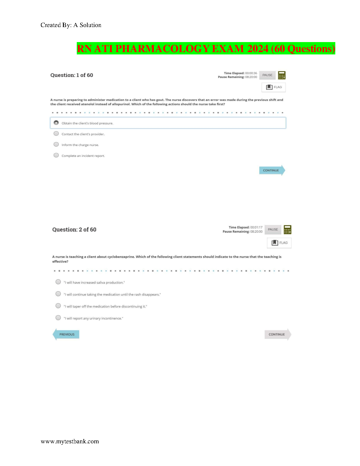 Unlock success in your nursing studies with our latest ATI RN Pharmacology 2024 Test Bank. This comprehensive resource is your key to mastering the ATI Pharmacology exam, featuring a full set of 60 practice questions complete with accurate, in-depth answers and rationales. Designed to simulate the real exam experience, this study guide will enhance your understanding of critical pharmacology principles, improve your test-taking skills, and build the confidence you need to excel. Get instant access to this invaluable tool and take the definitive step towards acing your pharmacology assessment.