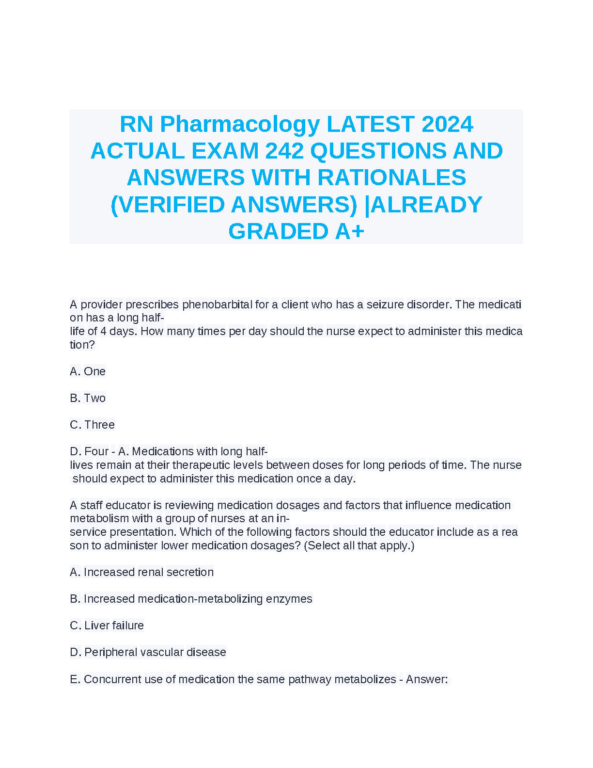 Elevate your pharmacology knowledge and ace your nursing exams with our comprehensive RN Pharmacology Test Bank for 2024. This premium study guide features 242 meticulously crafted questions complete with verified answers and in-depth rationales. Each rationale is designed to deepen your understanding of complex pharmacological concepts, ensuring you not only memorize but also comprehend the material. Perfect for RN students aiming for an A+ grade, this resource is your key to mastering drug classifications, side effects, and nursing considerations. Prepare confidently and pass your pharmacology exam on the first try!