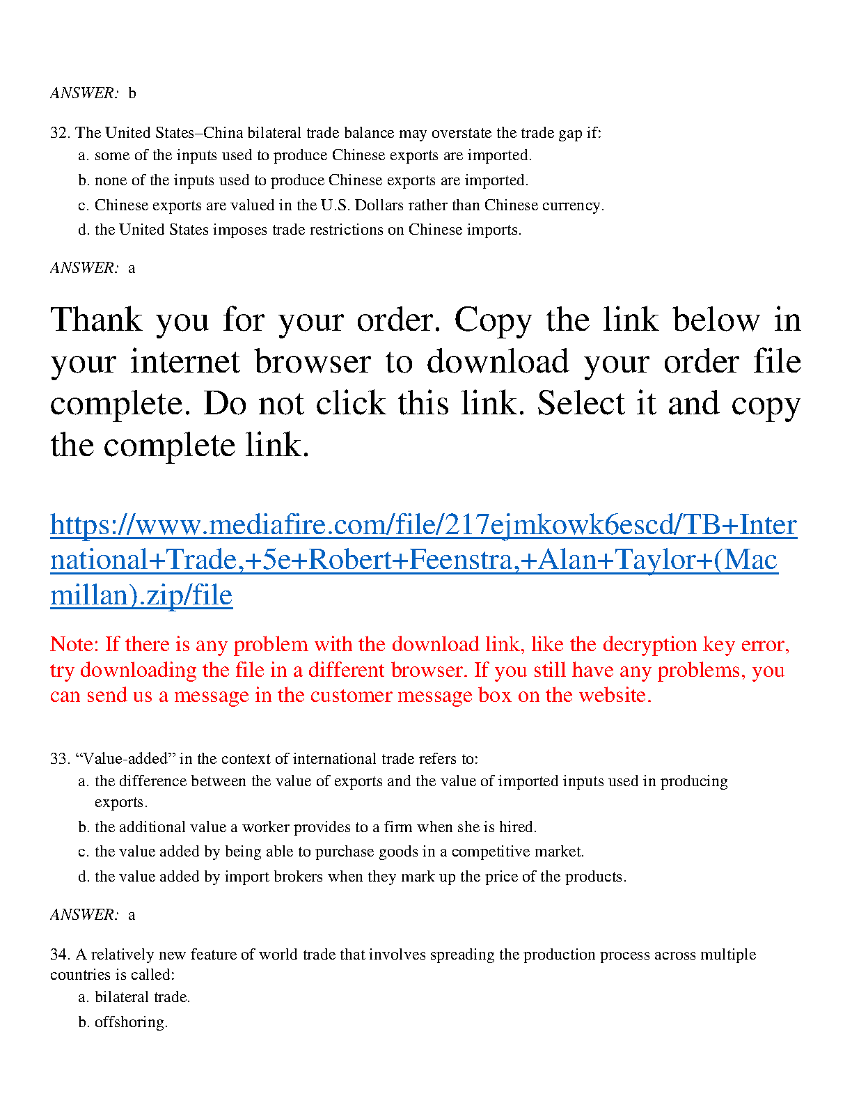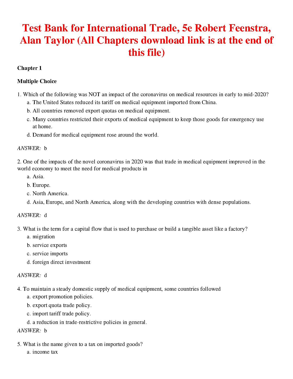 Test Bank for International Trade, 5th Edition by Robert C. Feenstra & Alan M. Taylor (All Chapters)