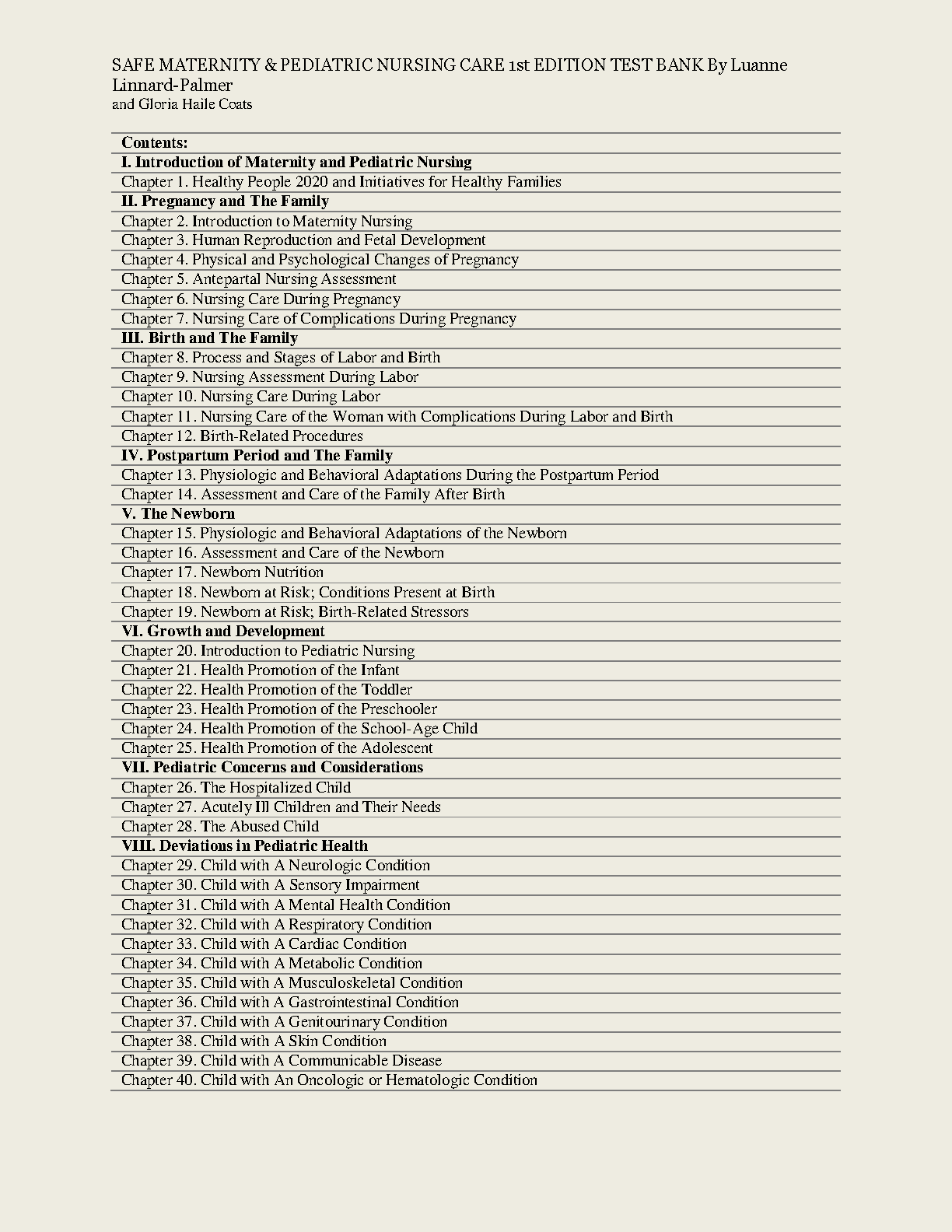 Master the essentials of maternal and child health with the official Test Bank for 'Safe Maternity & Pediatric Nursing Care,' 1st Edition by Luanne Linnard-Palmer and Gloria Haile Coats. This indispensable resource is packed with a comprehensive collection of exam-style questions, complete with detailed rationales, covering every chapter of the textbook. It's the ultimate study tool designed to help nursing students deepen their understanding, critically assess their knowledge, and confidently ace their exams in maternity and pediatric nursing.