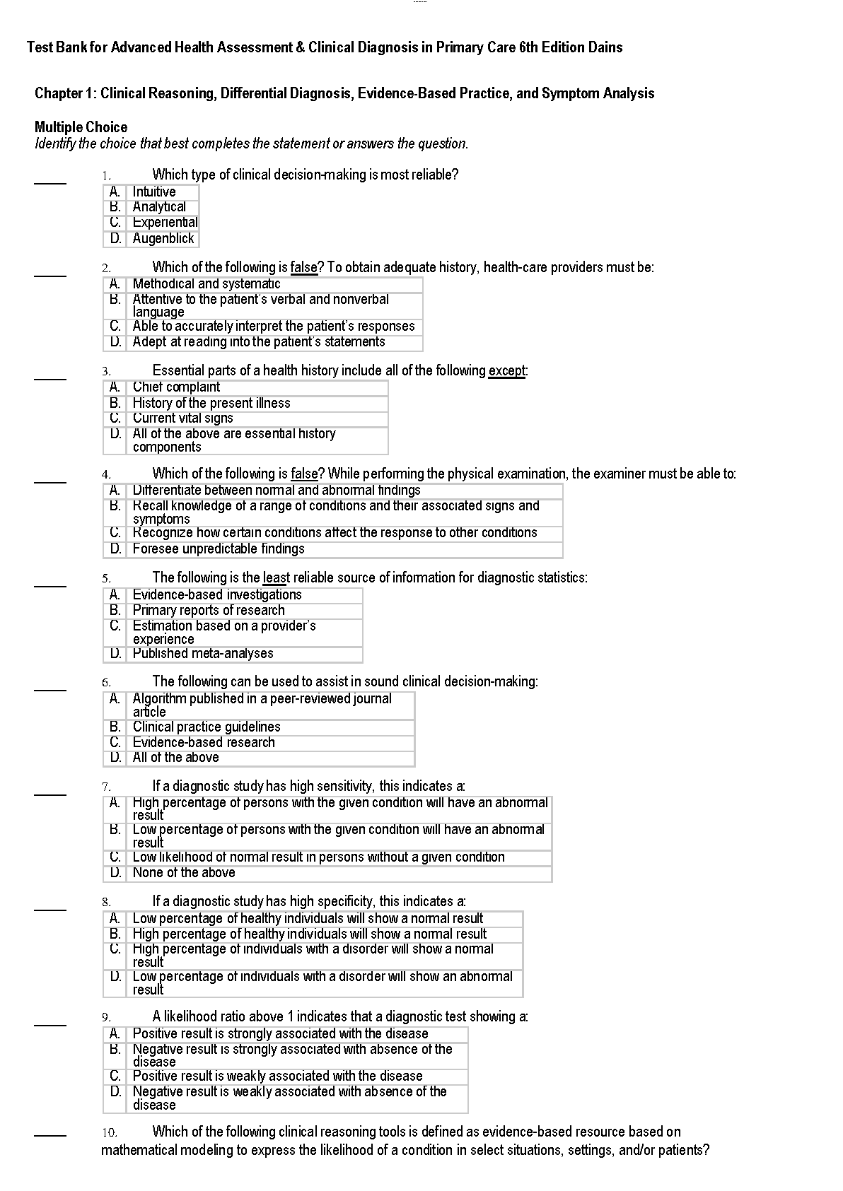 Gain the competitive edge you need to excel in your nursing studies with the official Test Bank for Advanced Health Assessment and Clinical Diagnosis in Primary Care, 6th Edition. Authored by Dains, Baumann, and Scheibel, this essential study guide is packed with hundreds of practice questions and detailed rationales that mirror the content and difficulty of your actual exams. Spanning all chapters, this resource is meticulously designed to help you master complex concepts, identify areas for improvement, and confidently pass your course. Download now to start preparing effectively and achieve academic success.
