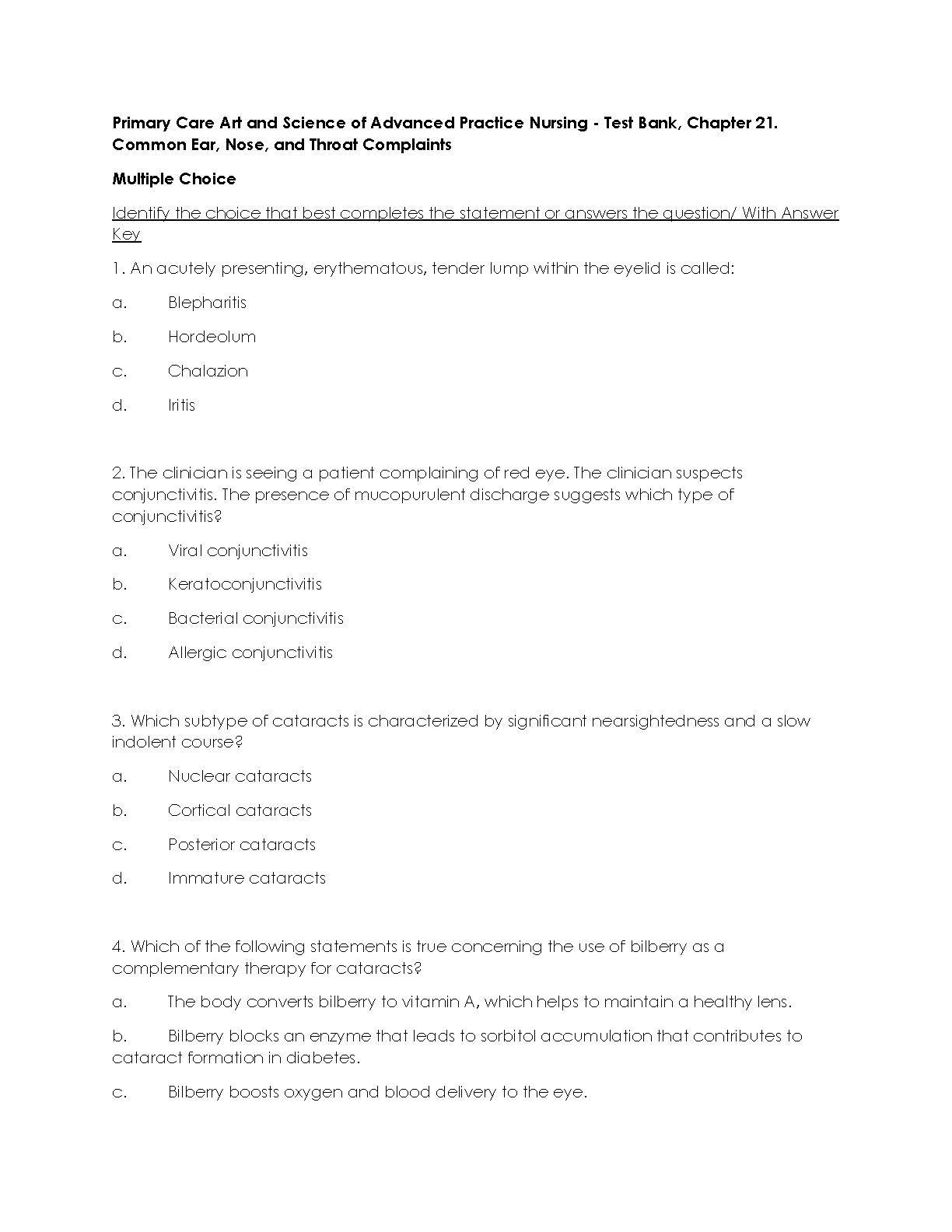 Test Bank For Primary Care Art and Science of Advanced Practice Nursing, Chapter 21. Common Ear, Nose, and Throat Complaints. DOWNLOAD on www.hackedexams.com INSTANTLY.