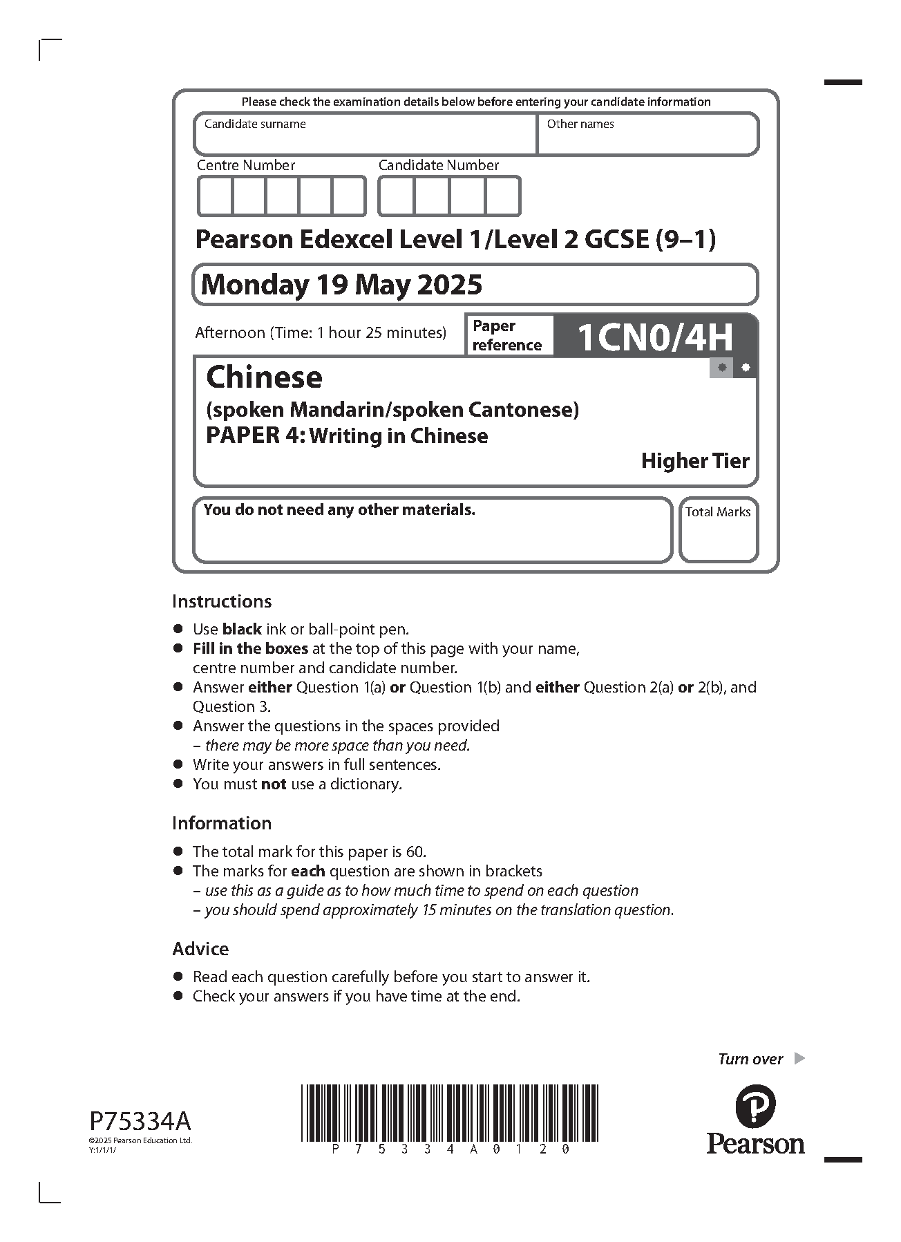 2025 Pearson Edexcel GCSE Chinese PAPER 4 (1CN0/4H: Writing in Chinese Higher Tier)