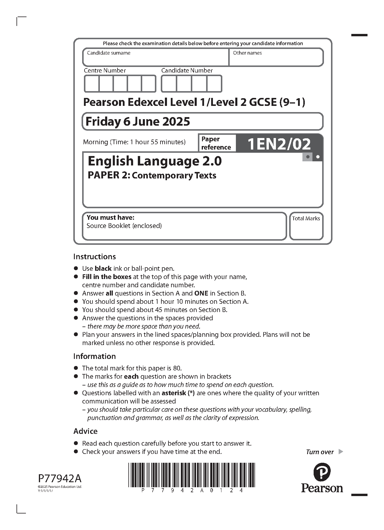 2025 Pearson Edexcel GCSE English Language PAPER 2.0 (1EN2/02: Contemporary Texts)