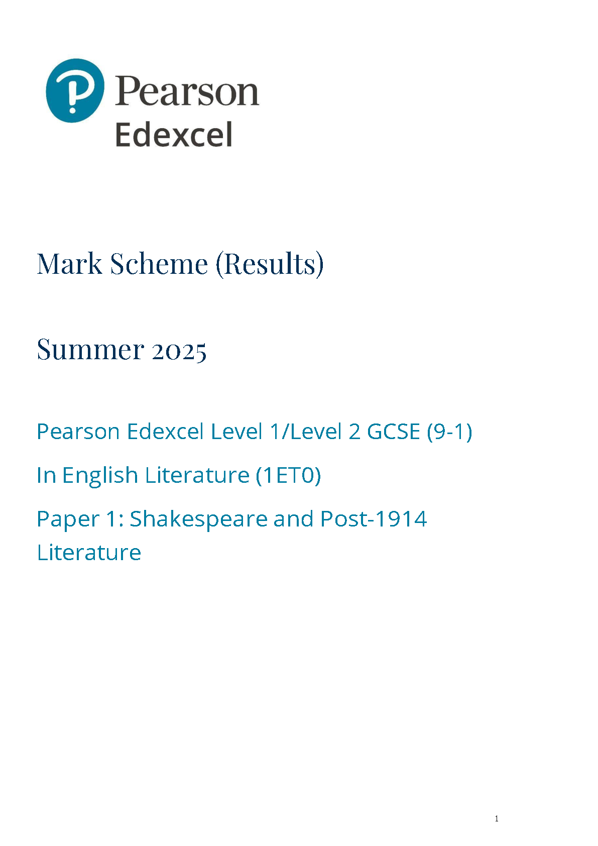 2025 Pearson Edexcel GCSE English Literature Mark Scheme PAPER 1 (1ET0/01: Shakespeare and Post-1914 Literature)