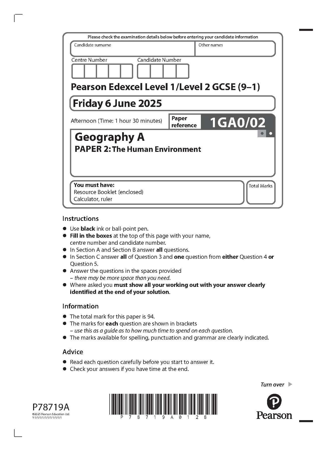 2025 Pearson Edexcel GCSE Geography A PAPER 2 (1GA0/02: The Human Environment)