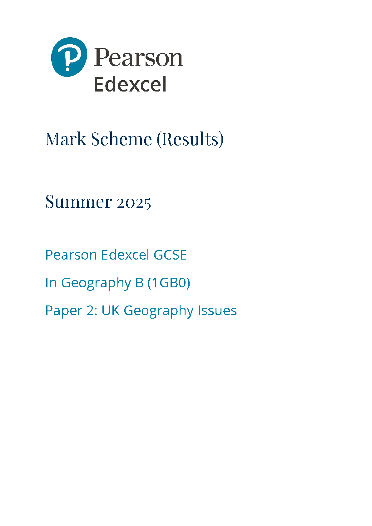 2025 Pearson Edexcel GCSE Geography B Mark Scheme PAPER 2 (1GB0/02: UK Geographical Issues)
