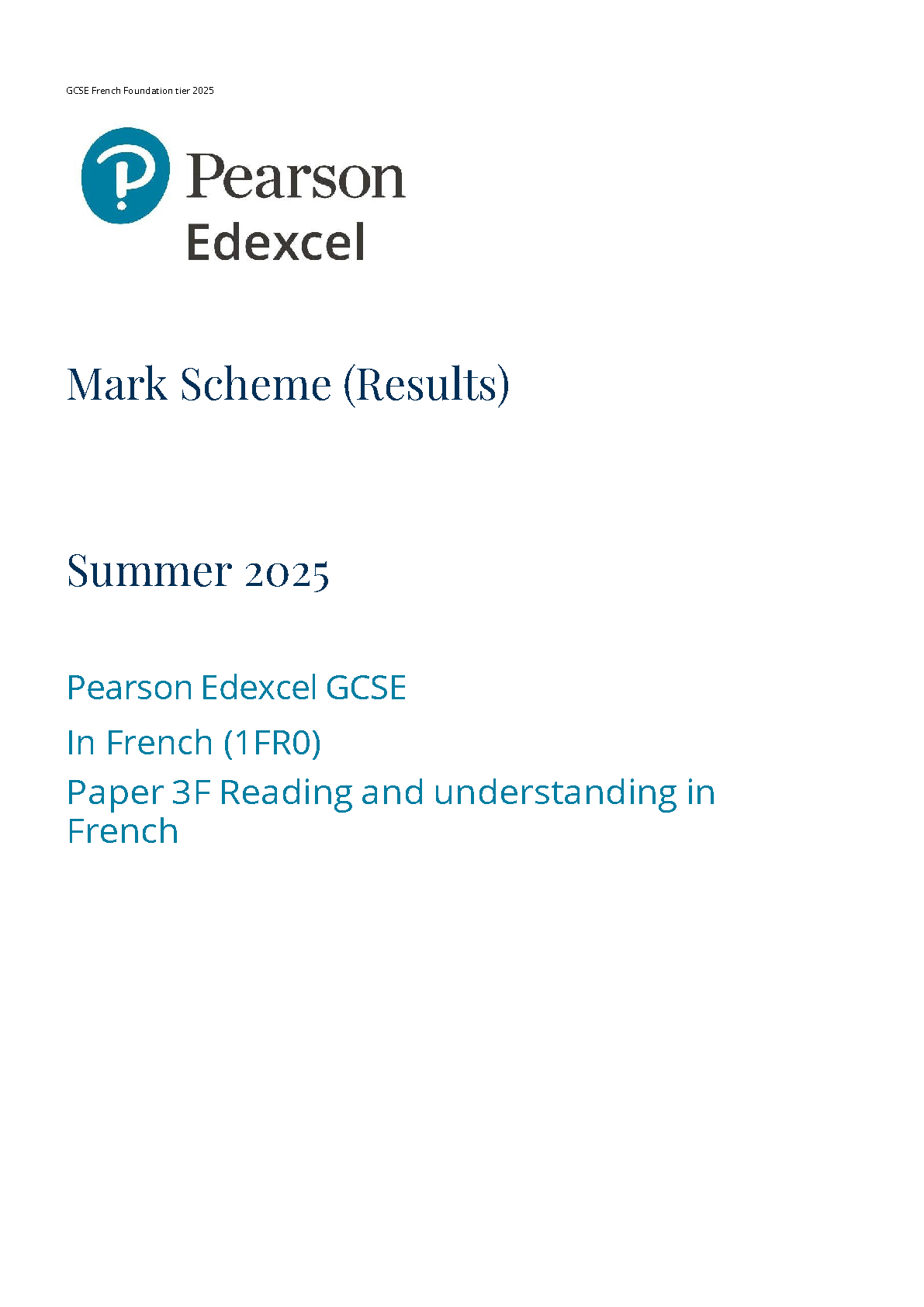 2025 Pearson Edexcel GCSE French Mark Scheme PAPER 3 (1FR0/3F: Reading and understanding in French Foundation Tier)