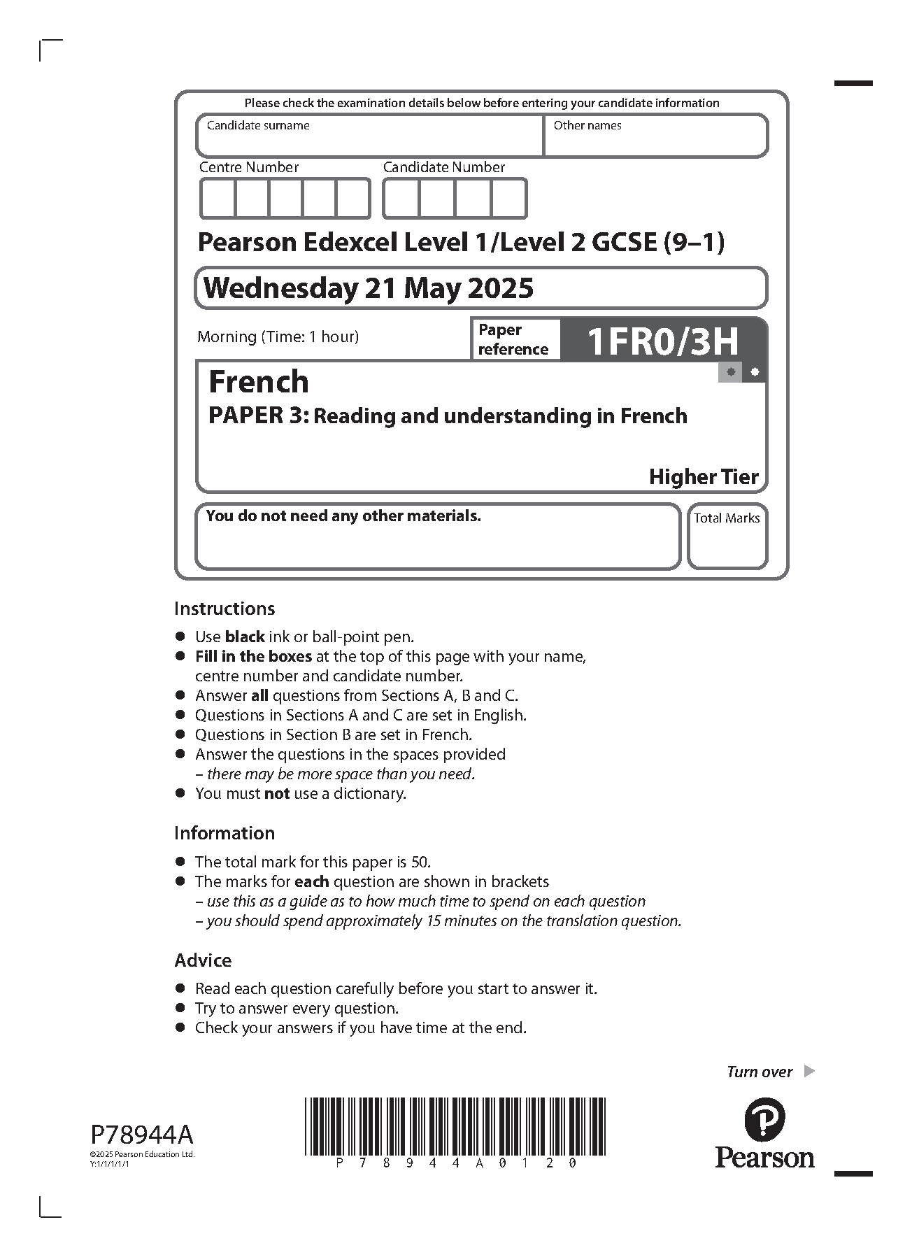 2025 Pearson Edexcel GCSE French PAPER 3 (1FR0/3H: Reading and understanding in French Higher Tier)
