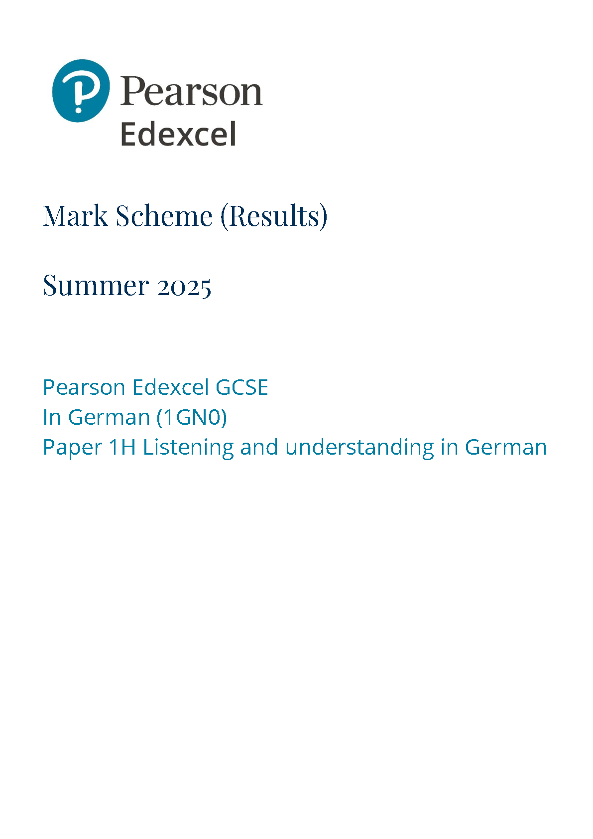 2025 Pearson Edexcel GCSE German Mark Scheme PAPER 1 (1GN0/1H: Listening and understanding in German Higher Tier)