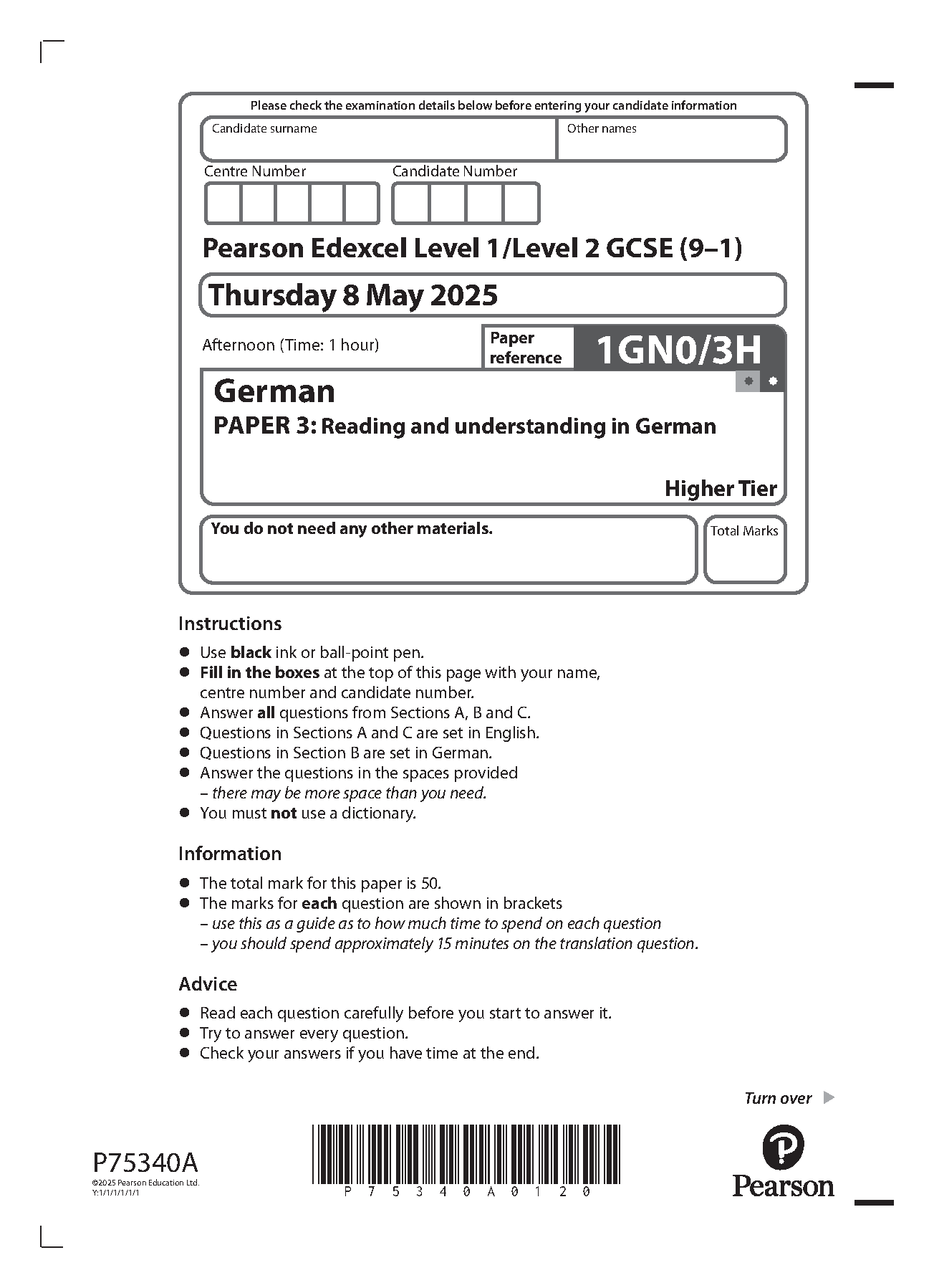 2025 Pearson Edexcel GCSE German PAPER 3 (1GN0/3H: Reading and understanding in German Higher Tier)