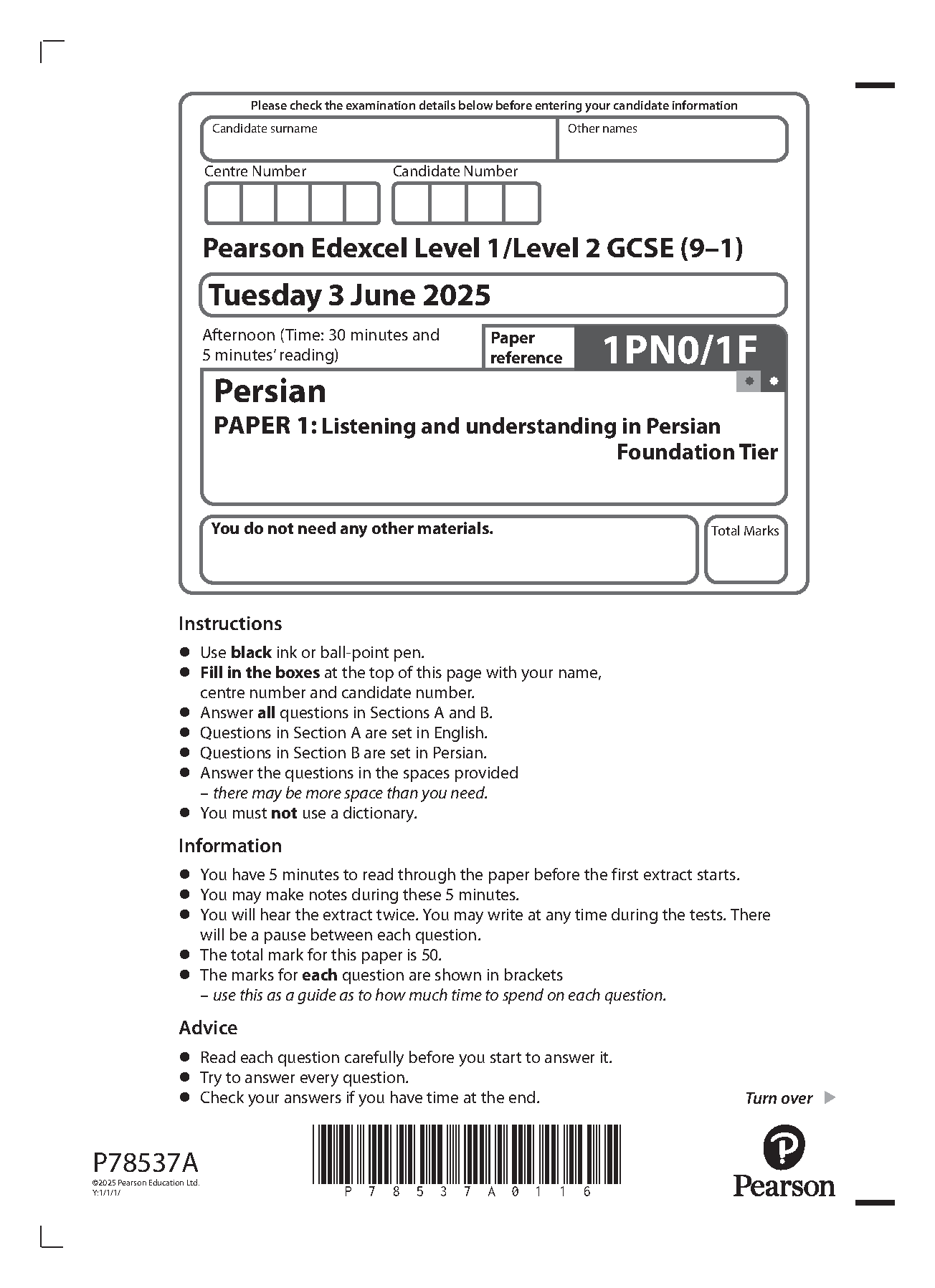 2025 Pearson Edexcel GCSE Persian Paper 1 (1PN0/1F: Listening and understanding in Persian Foundation Tier)