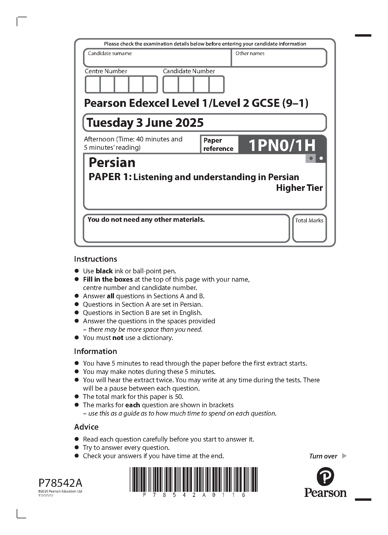 2025 Pearson Edexcel GCSE Persian Paper 1 (1PN0/1H: Listening and understanding in Persian Higher Tier)