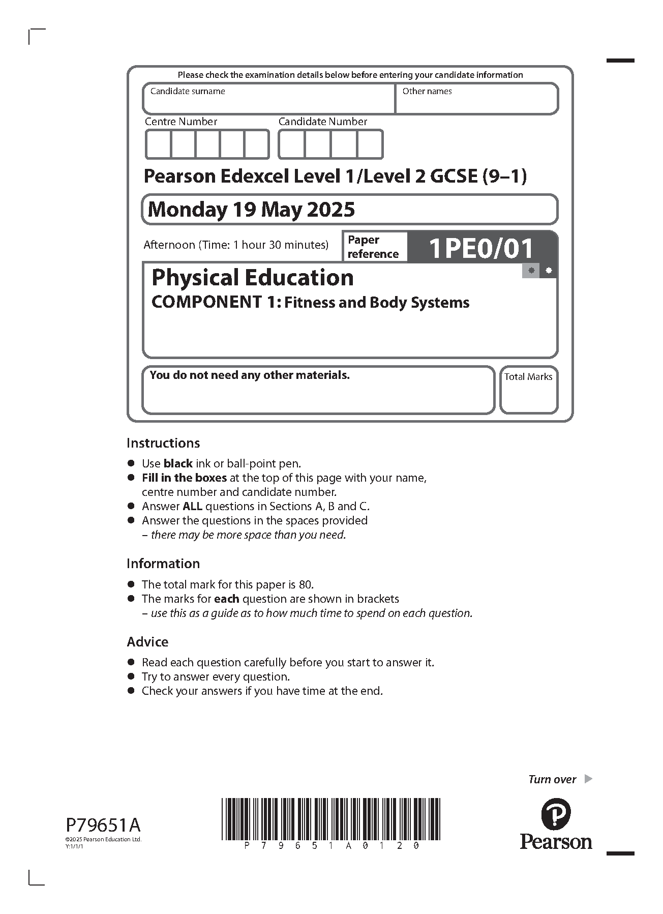 2025 Pearson Edexcel GCSE Physical Education Component 1 (1PE0/01: Fitness and Body Systems)