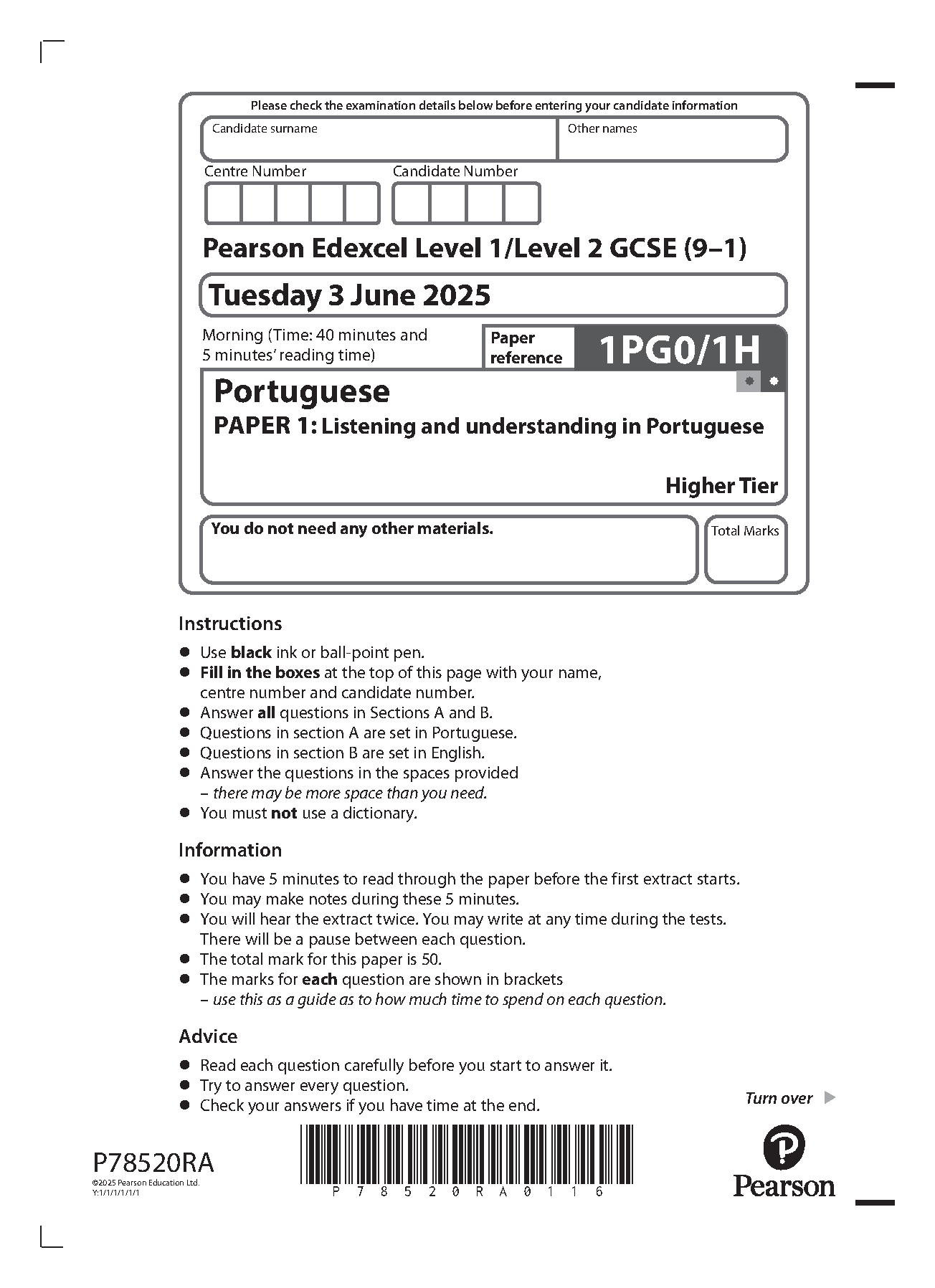 2025 Pearson Edexcel GCSE Portuguese Paper 1 (1PG0/1H: Listening and understanding in Portuguese Higher Tier)