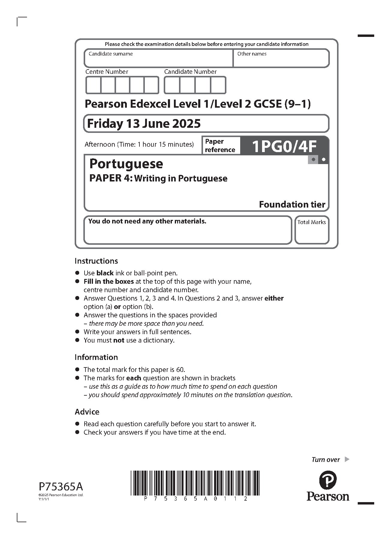 2025 Pearson Edexcel GCSE Portuguese Paper 4 (1PG0/4F: Writing in Portuguese Foundation Tier)