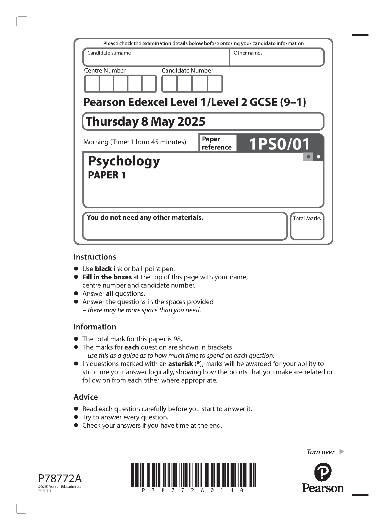 2025 Pearson Edexcel GCSE Psychology Paper 1 (1PS0/01)