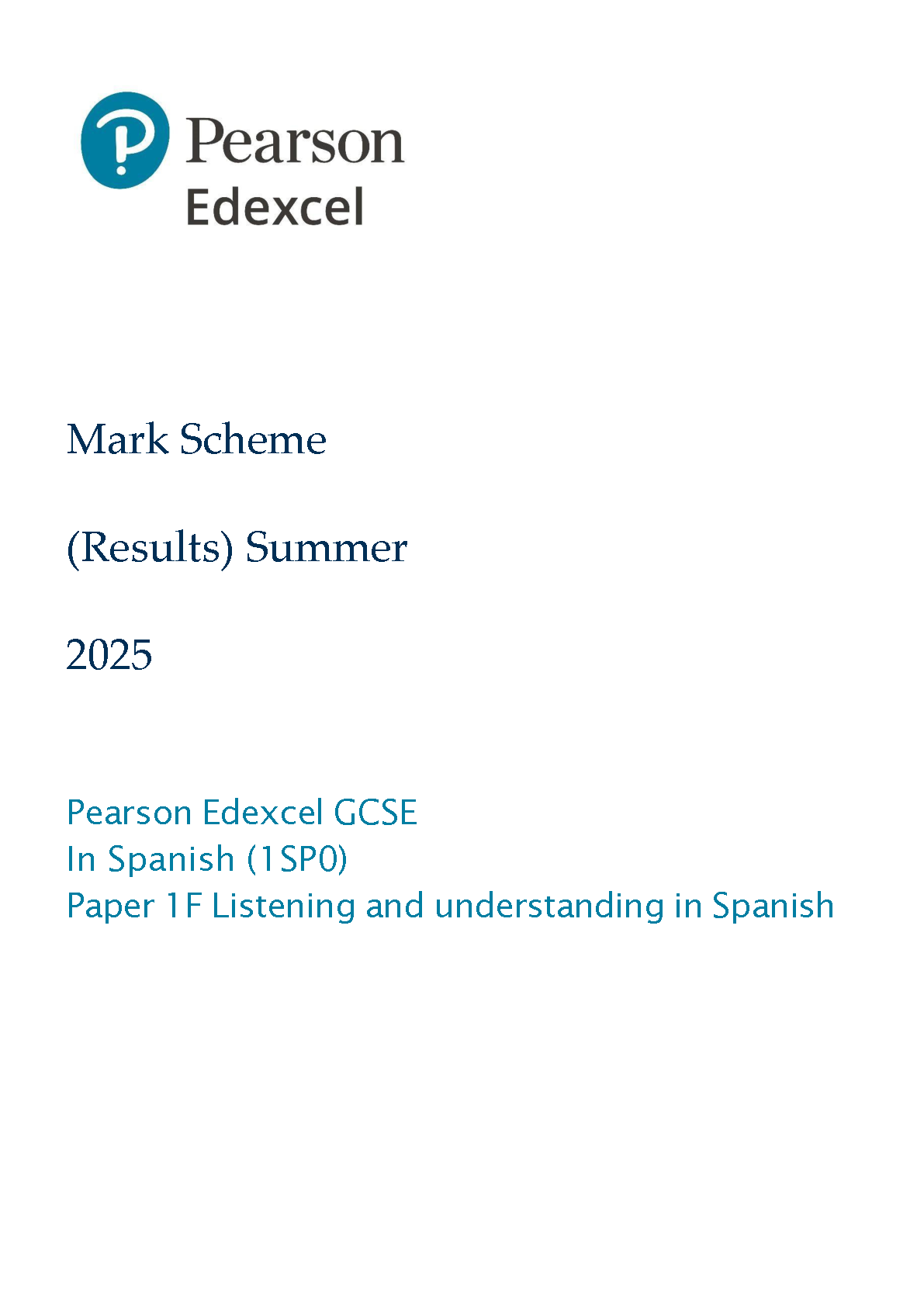 2025 Pearson Edexcel GCSE Spanish Mark Scheme Paper 1 (1SP0/1F: Listening and understanding in Spanish Foundation Tier)