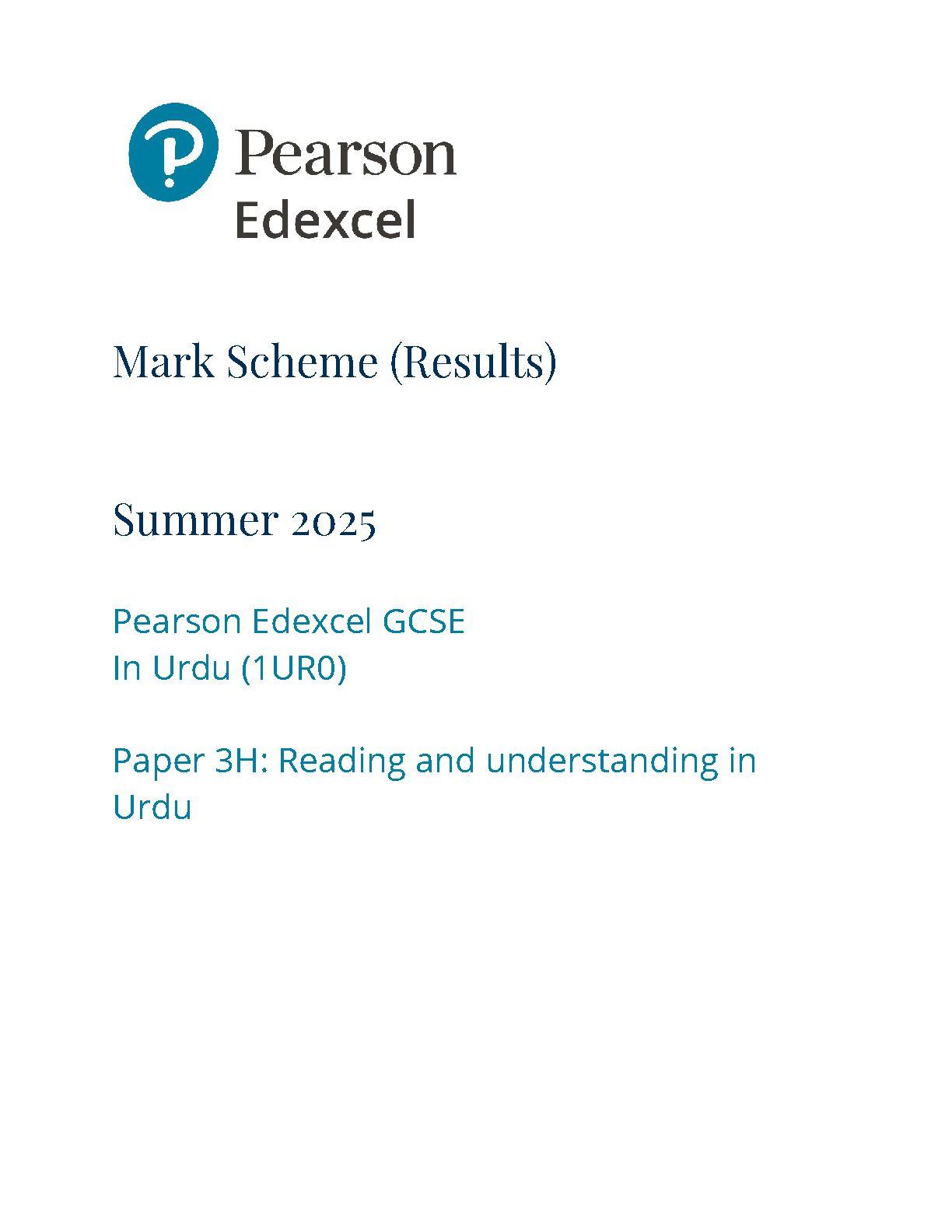 2025 Pearson Edexcel GCSE Urdu Mark Scheme (1UR0/3H: Reading and understanding in Urdu)