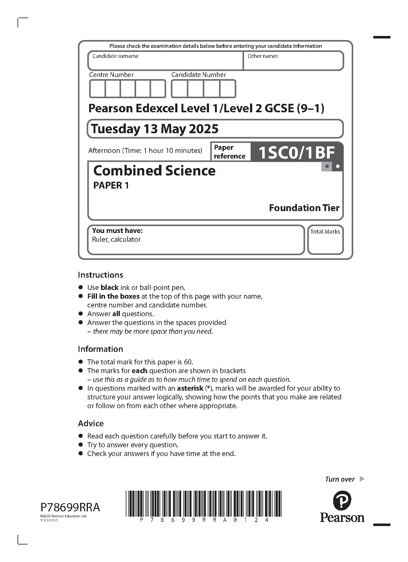 2025 Pearson Edexcel GCSE Combined Science Paper 1 (1SC0/1BF: Foundation Tier)