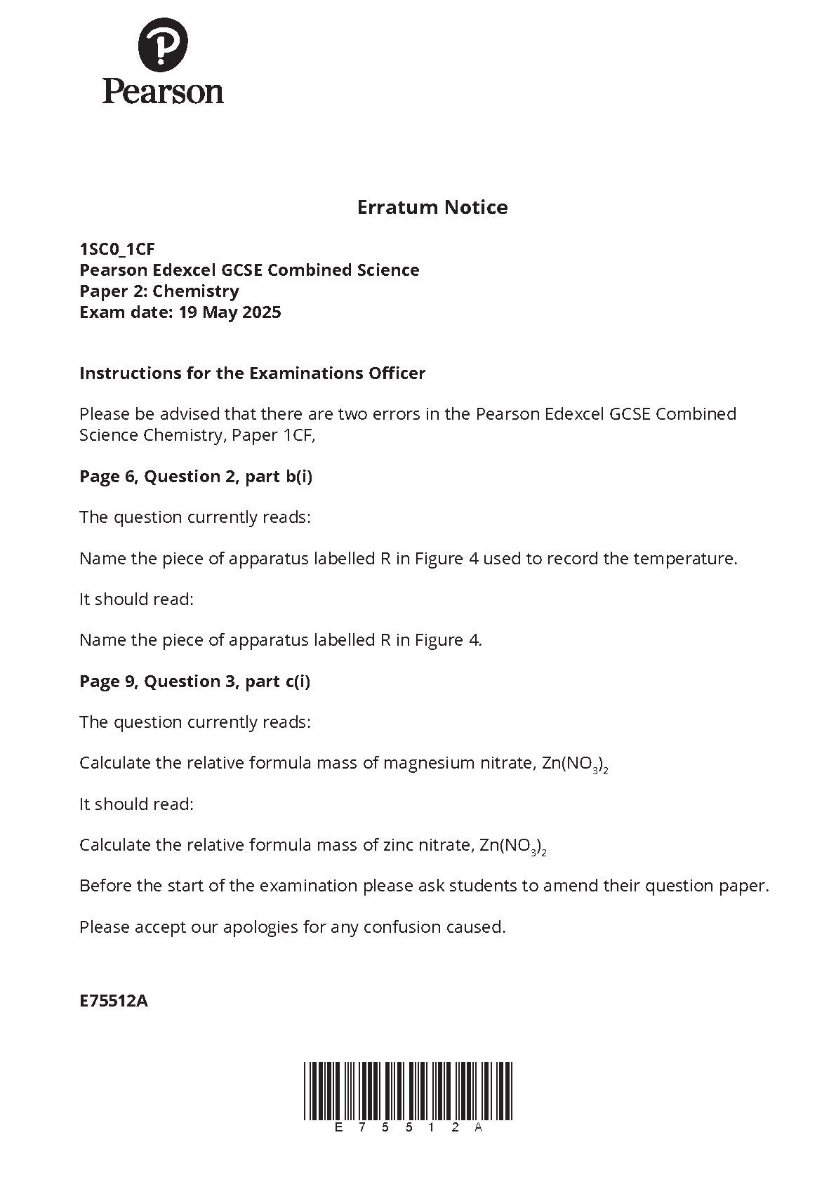 2025 Pearson Edexcel GCSE Combined Science Chemistry Paper 1 ((1SC0/1CF)