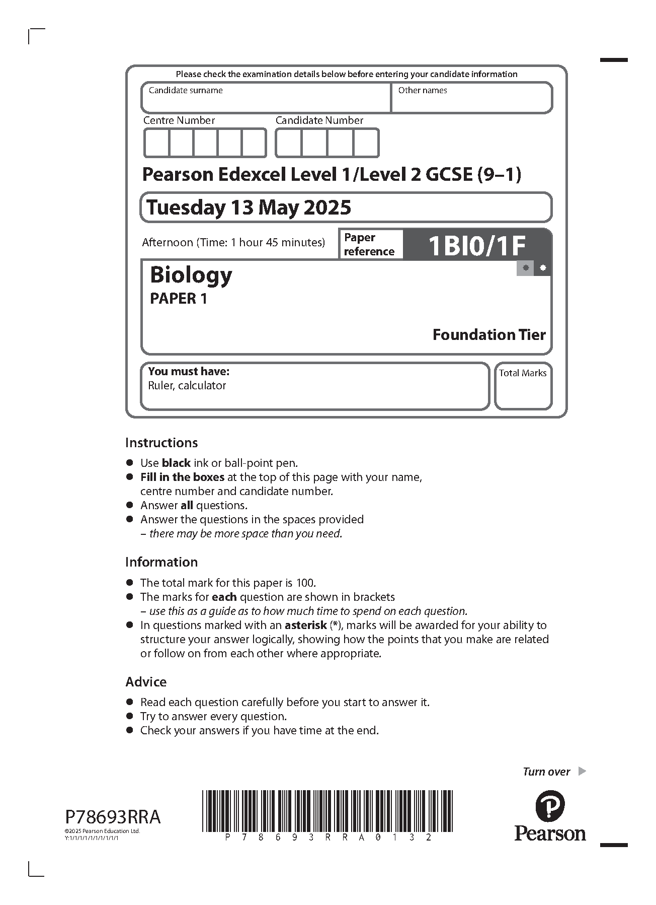 2025 Pearson Edexcel GCSE Biology Paper 1 (1BI0/1F: Foundation Tier)