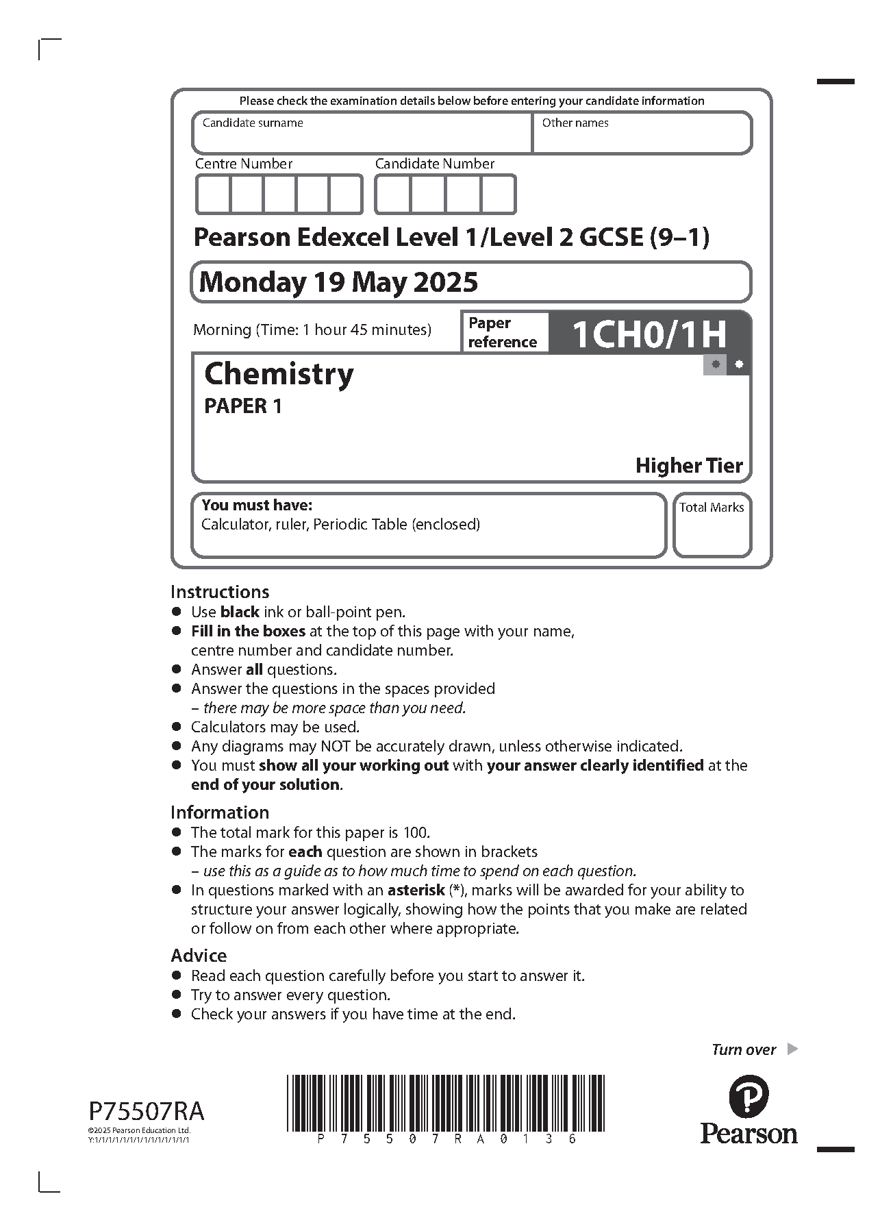2025 Pearson Edexcel GCSE Chemistry Paper 1 (1CH0/1H)