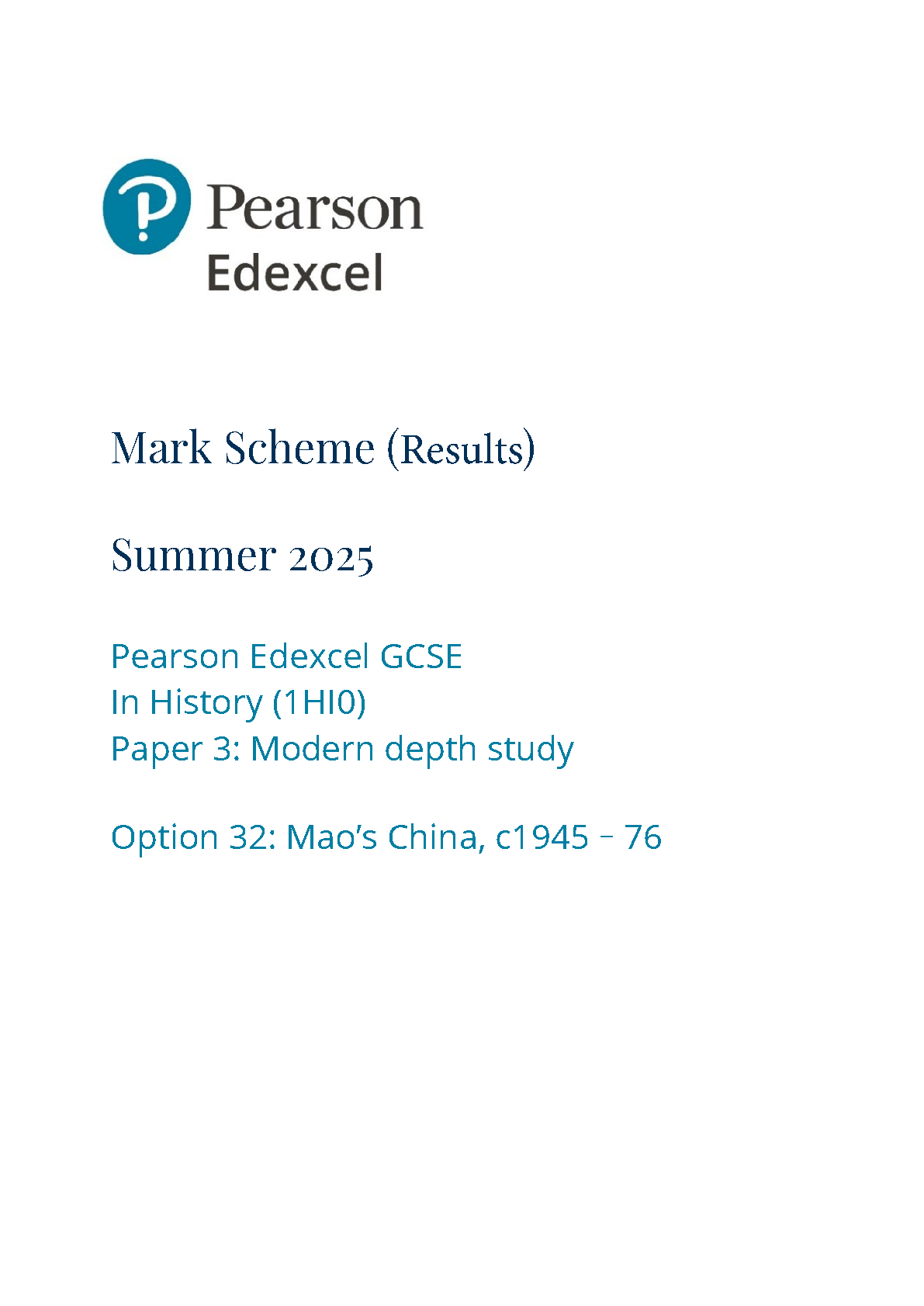 2025 Pearson Edexcel GCSE History Mark Scheme Paper 3 (1HI0/32: Modern depth study)