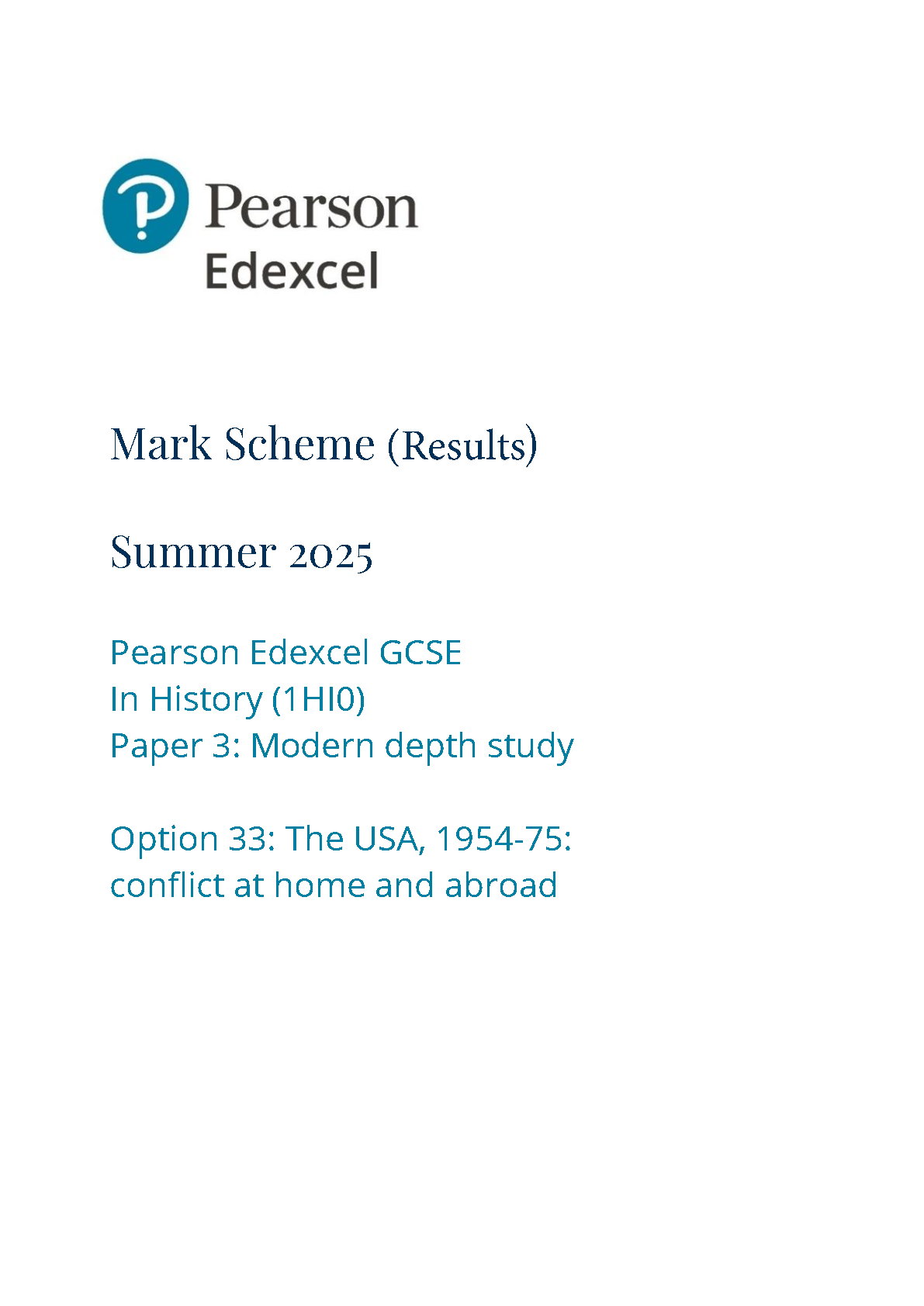 2025 Pearson Edexcel GCSE History Mark Scheme Paper 3 (1HI0/33: Modern depth study)