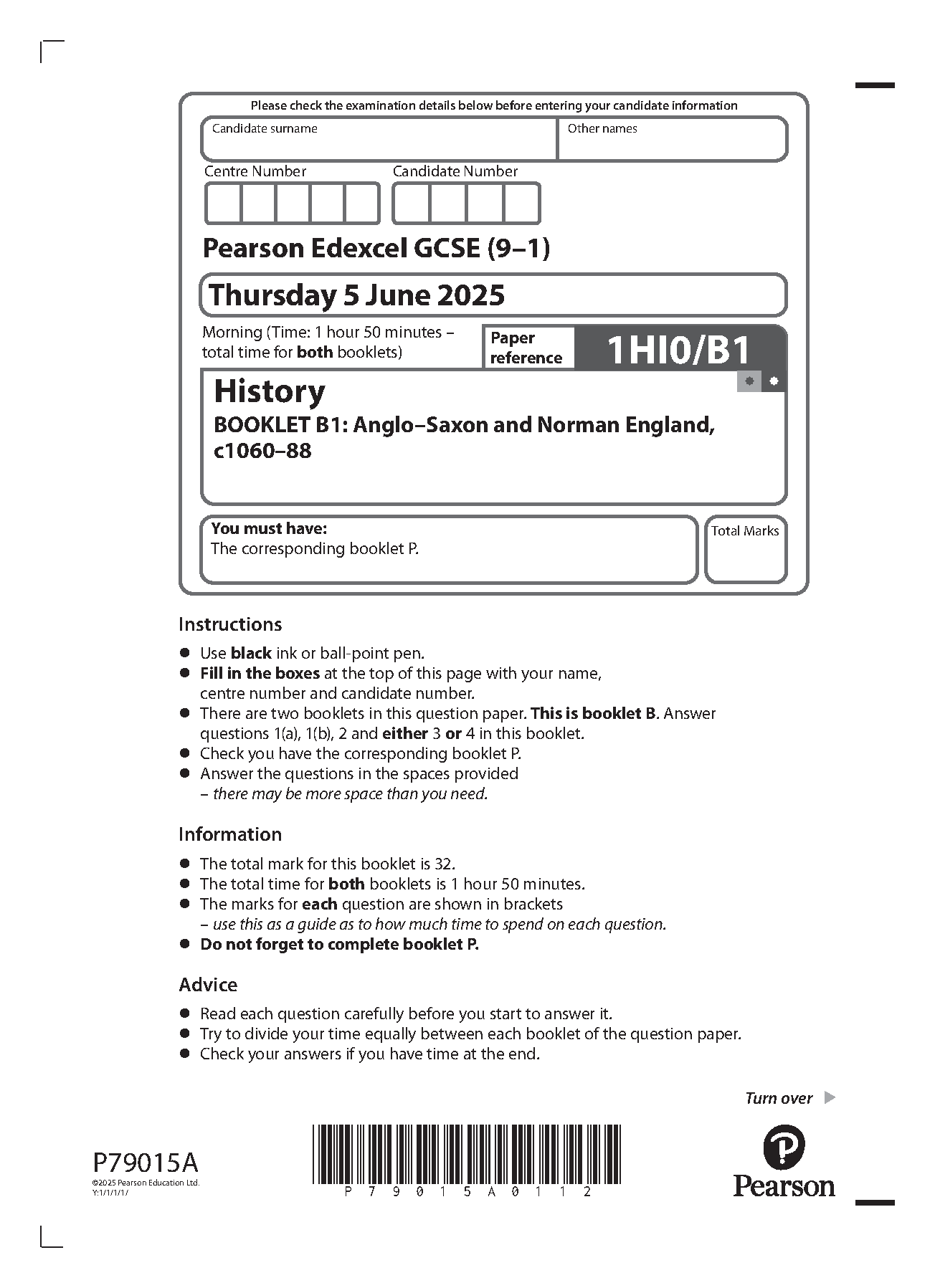 2025 Pearson Edexcel GCSE History BOOKLET B1 (1HI0/B1:Anglo–Saxon and Norman England, c1060–88)