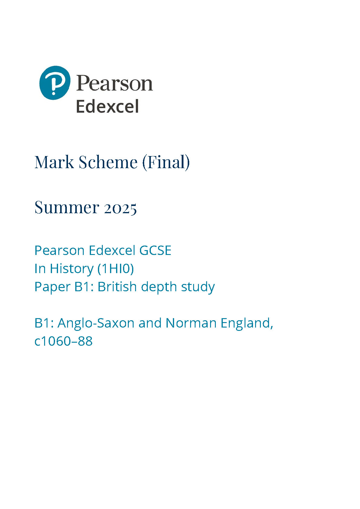 2025 Pearson Edexcel GCSE History Mark Scheme BOOKLET B1 (1HI0/B1:Anglo–Saxon and Norman England, c1060–88)