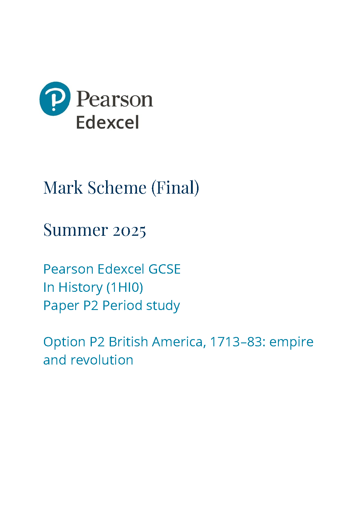 2025 Pearson Edexcel GCSE History Mark Scheme BOOKLET P2 (1HI0/P2 : Period study)