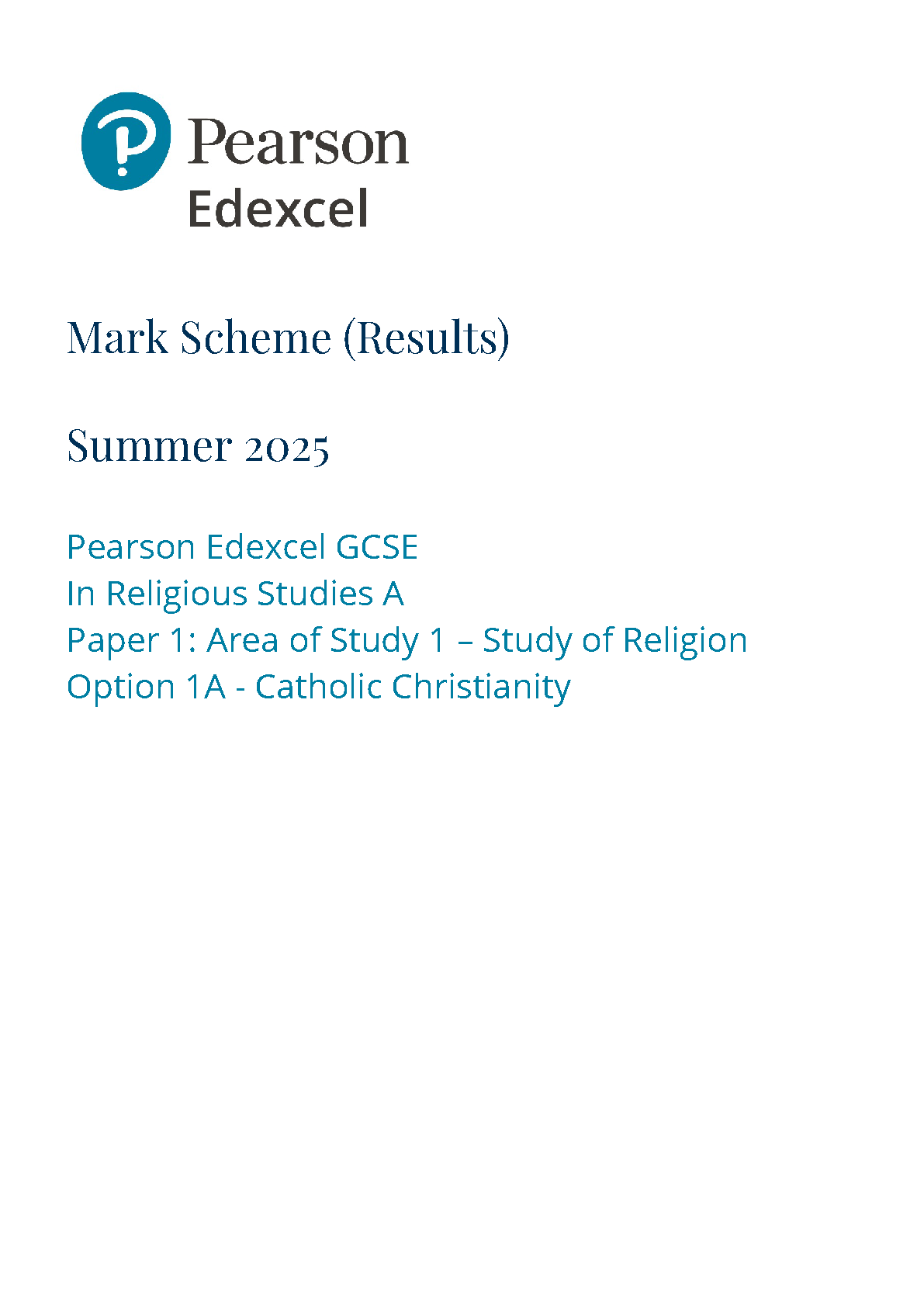 2025 Pearson Edexcel GCSE Religious Studies A Mark Scheme Paper 1 (1RA0/1A: Area of Study 1 – Study of Religion)