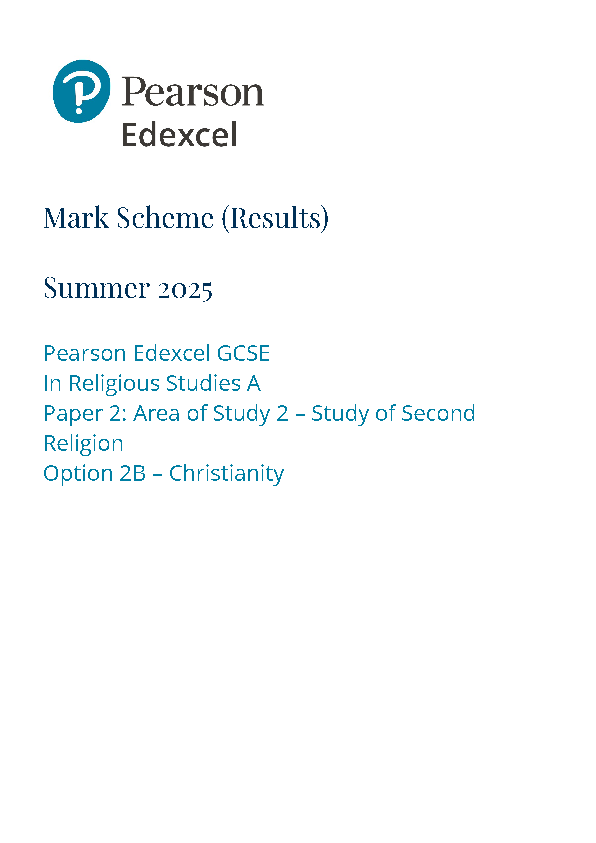 2025 Pearson Edexcel GCSE Religious Studies A Mark Scheme Paper 2 (1RA0/2B: Area of Study 2 – Study of Second Religion)