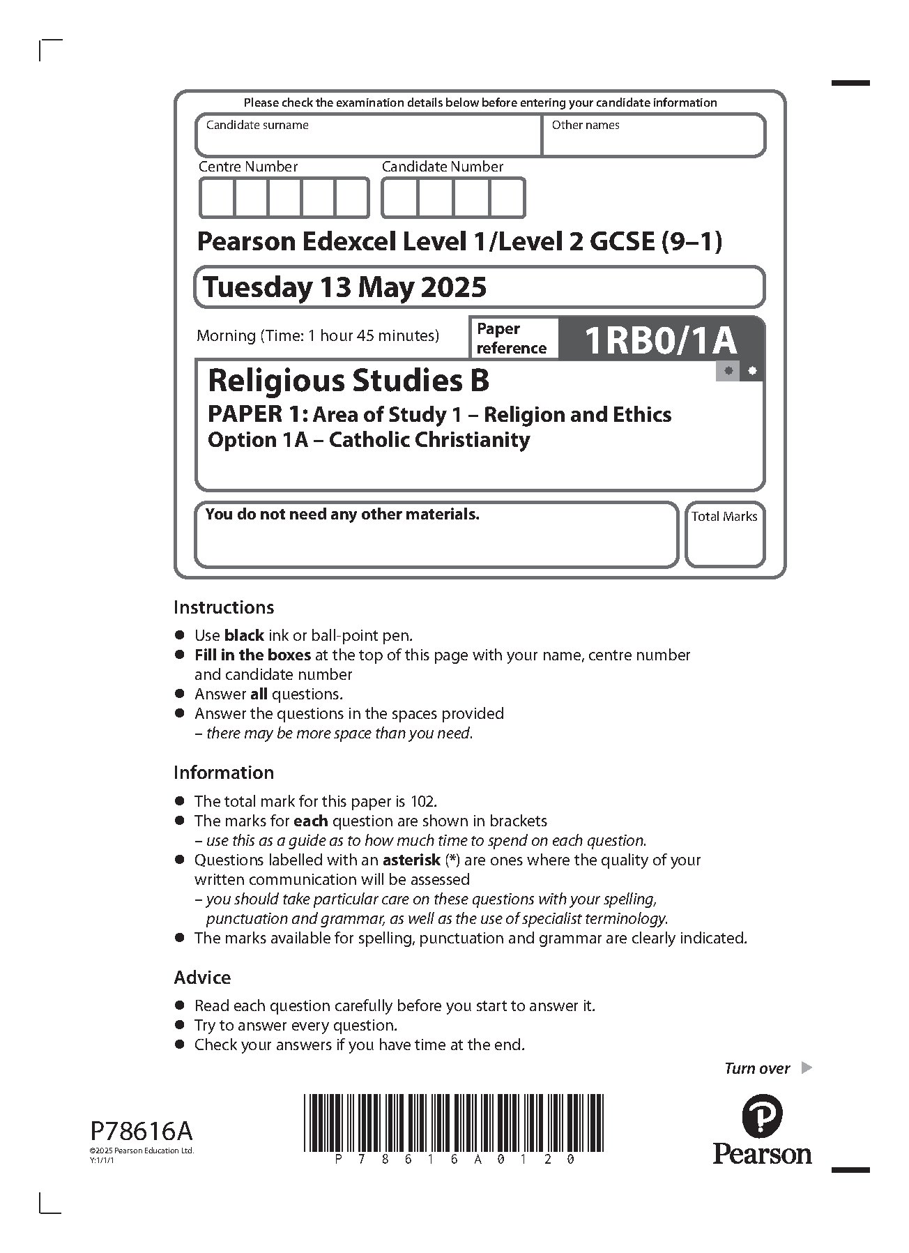 2025 Pearson Edexcel GCSE Religious Studies B Paper 1A (1RB0/1A: Area of Study 1 – Religion and Ethics)