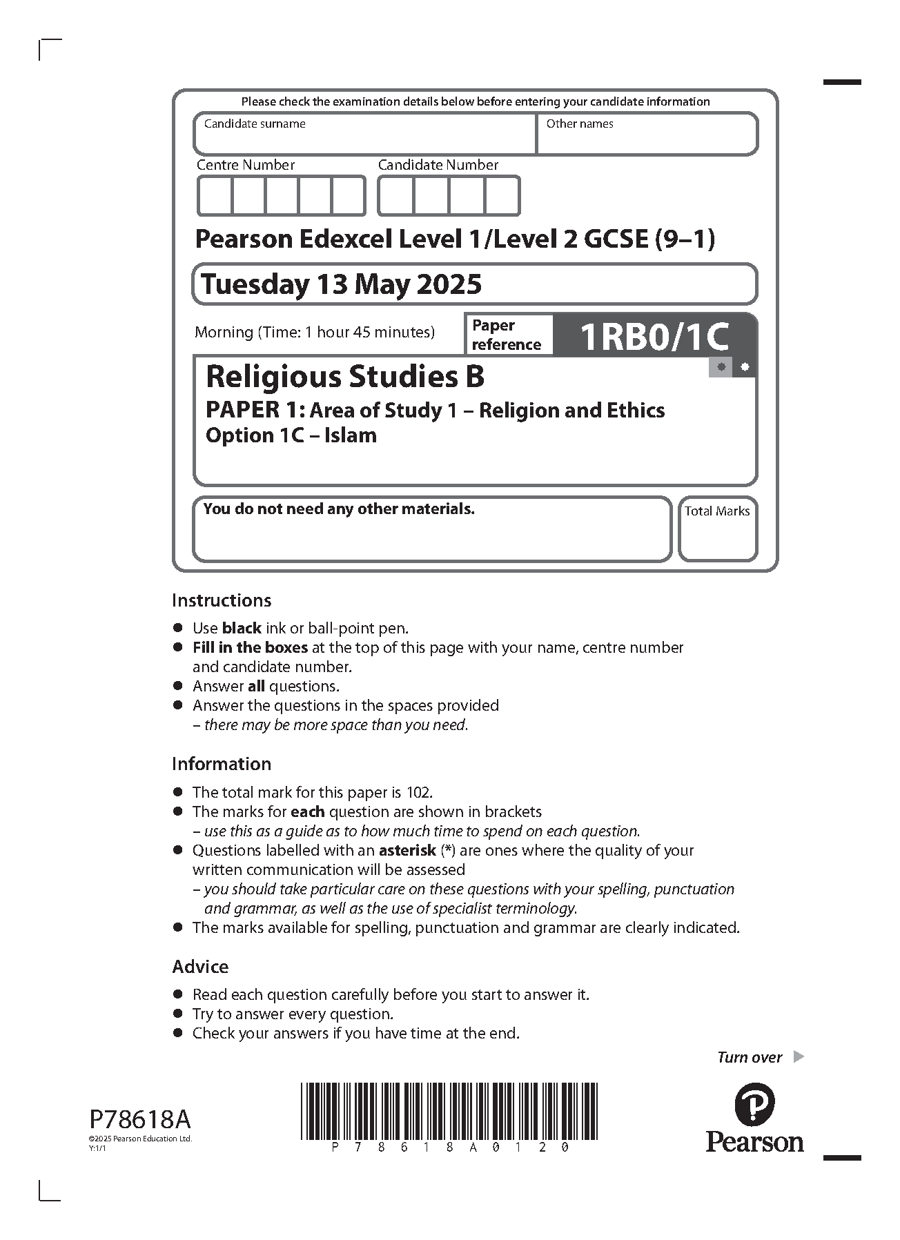 2025 Pearson Edexcel GCSE Religious Studies B Paper 1C (1RB0/1C: Area of Study 1 – Religion and Ethics)