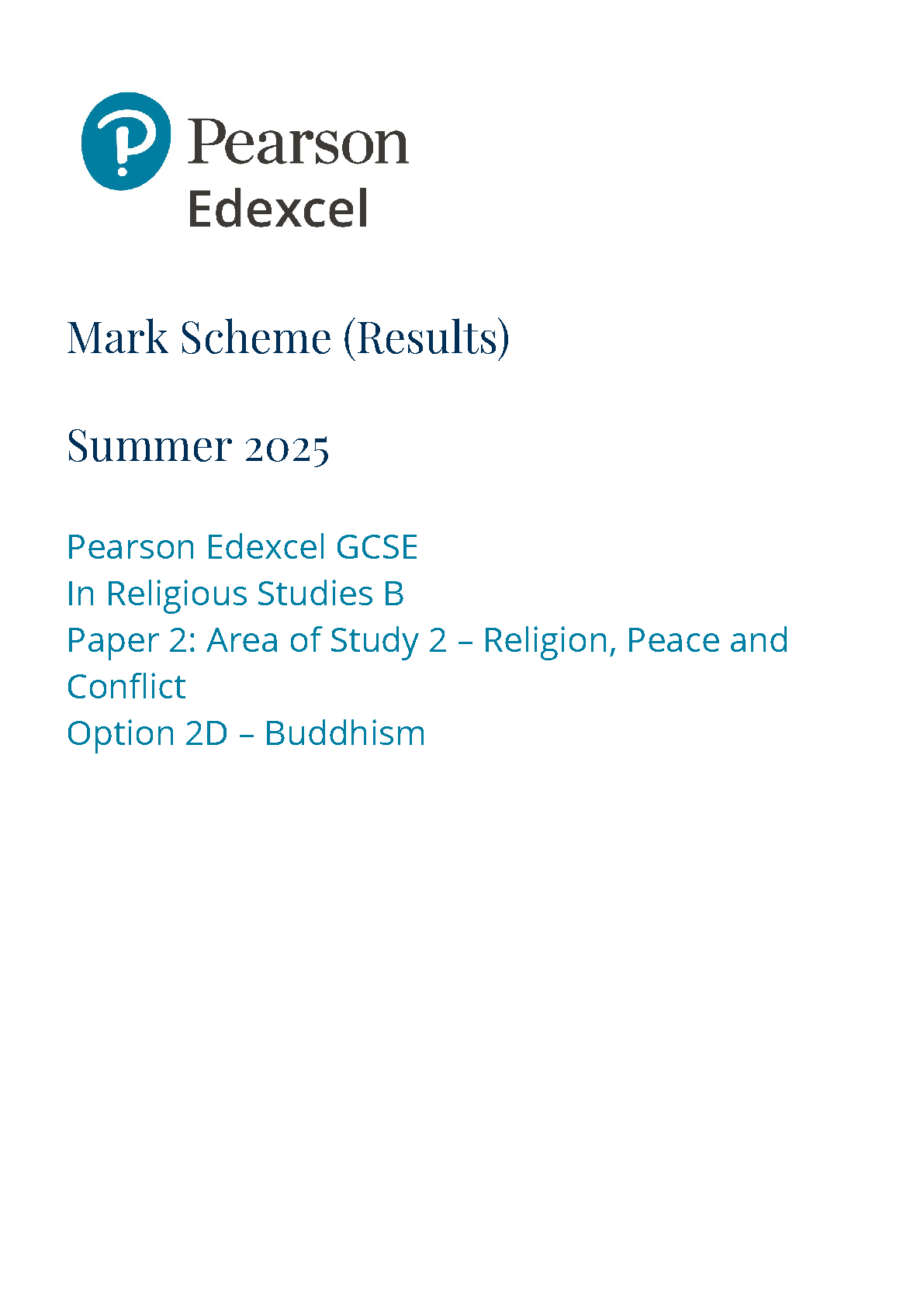 2025 Pearson Edexcel GCSE Religious Studies B Mark Scheme Paper 2D (1RB0/2D: Area of Study 2 – Religion, Peace and Conflict )