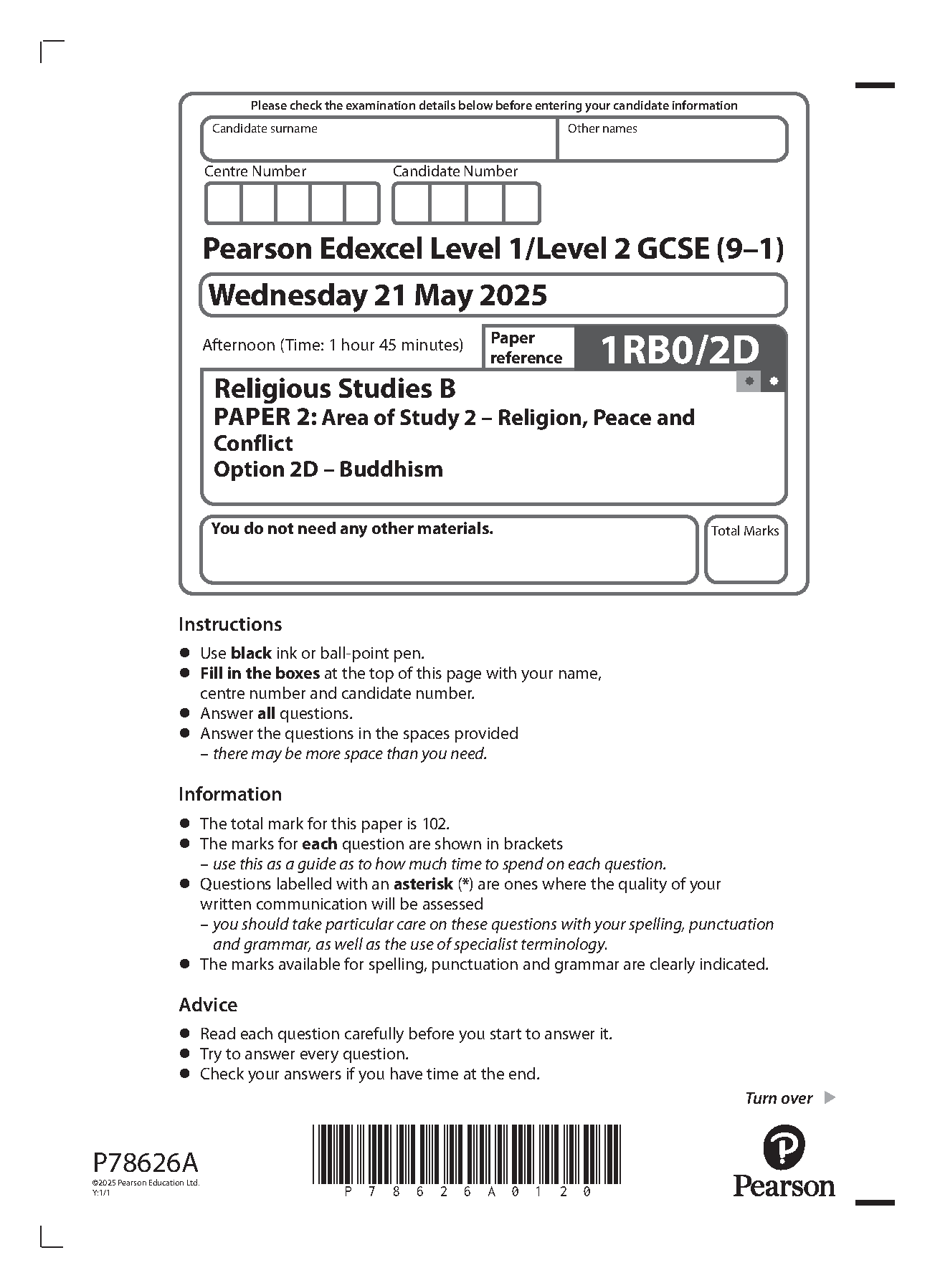 2025 Pearson Edexcel GCSE Religious Studies B Paper 2D (1RB0/2D: Area of Study 2 – Religion, Peace and Conflict )