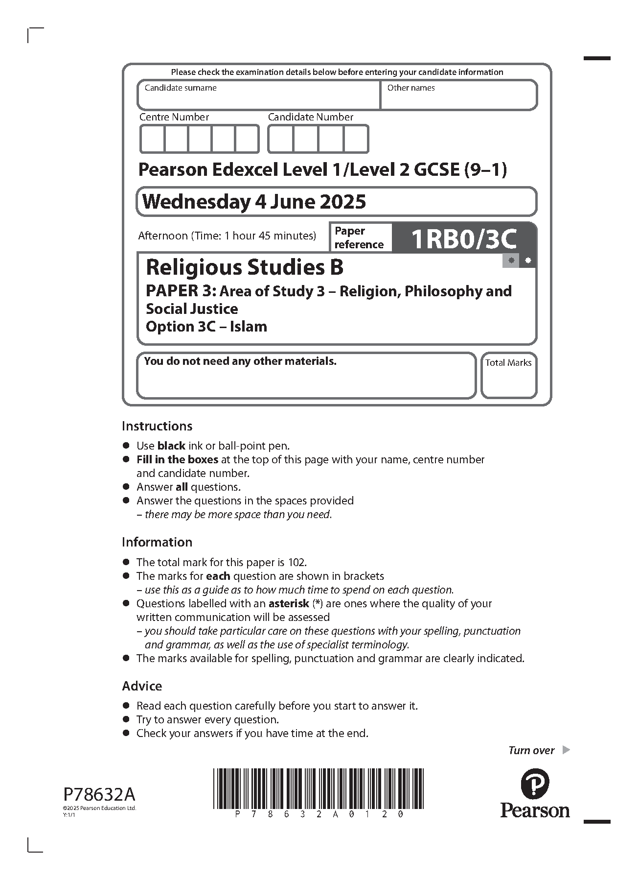 2025 Pearson Edexcel GCSE Religious Studies B Paper 3C (1RB0/3C: Area of Study 3 – Religion, Philosophy and Social Justice)