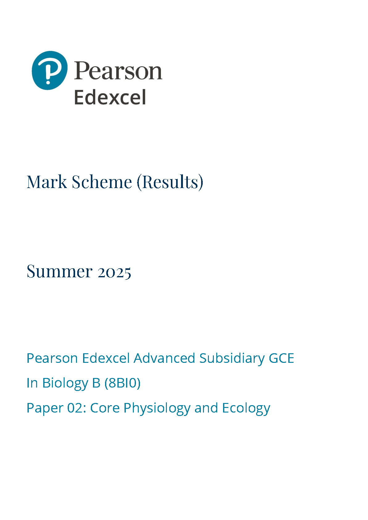 2025 Pearson Edexcel As Level Biology B Mark Scheme Paper 2 (8BI0/02: Core Physiology and Ecology)
