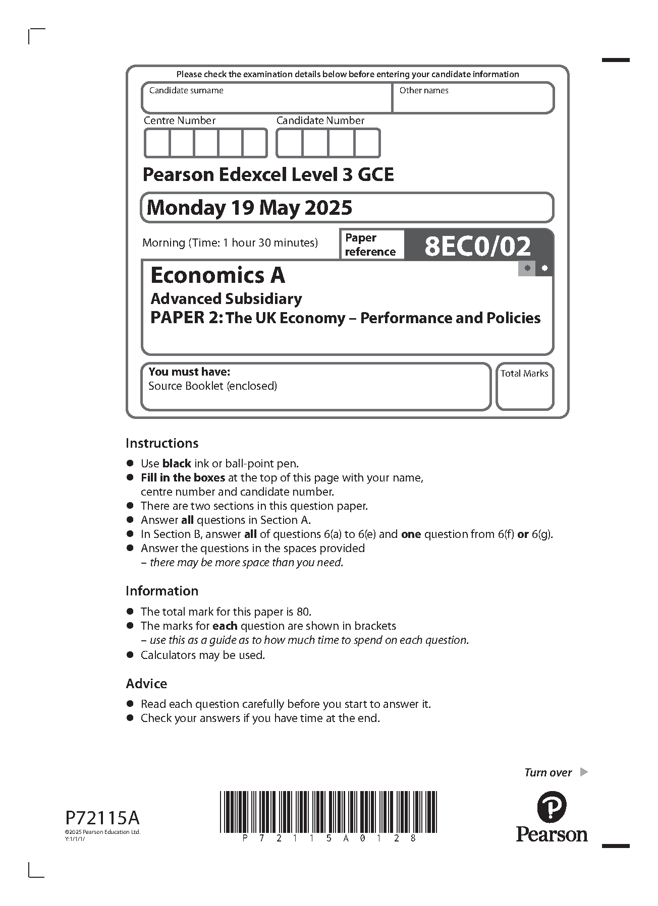 2025 Pearson Edexcel AS Level Economics A Paper 2 (8EC0/02: The UK Economy – Performance and Policies)