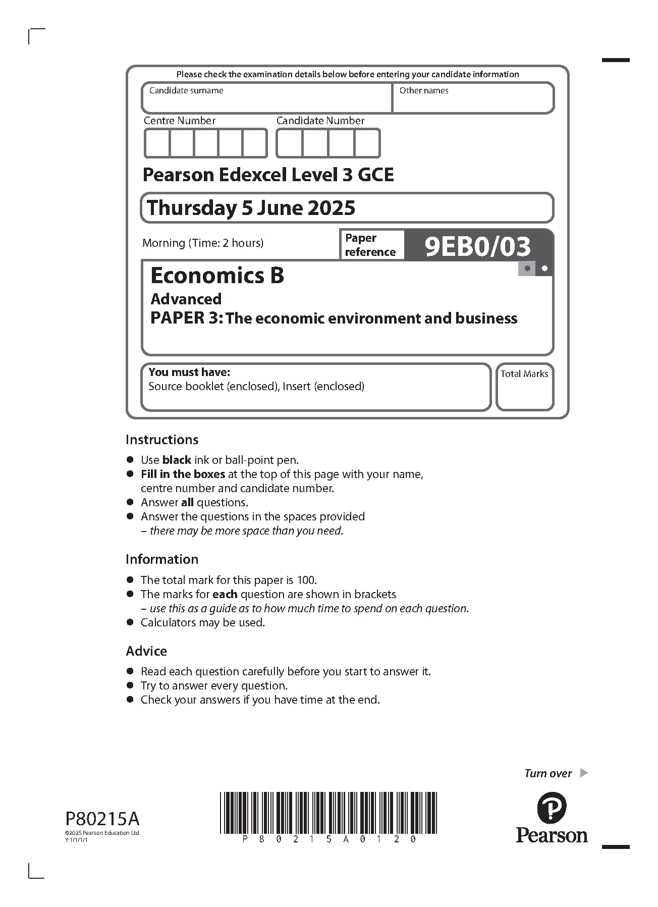 2025 Pearson Edexcel A Level Economics B Paper 3 (9EB0/03: The economic environment and business)
