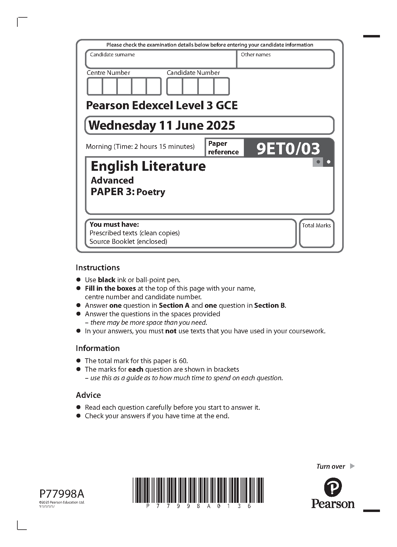 2025 Pearson Edexcel A Level English Literature Paper 3 (9ET0/03: Poetry)