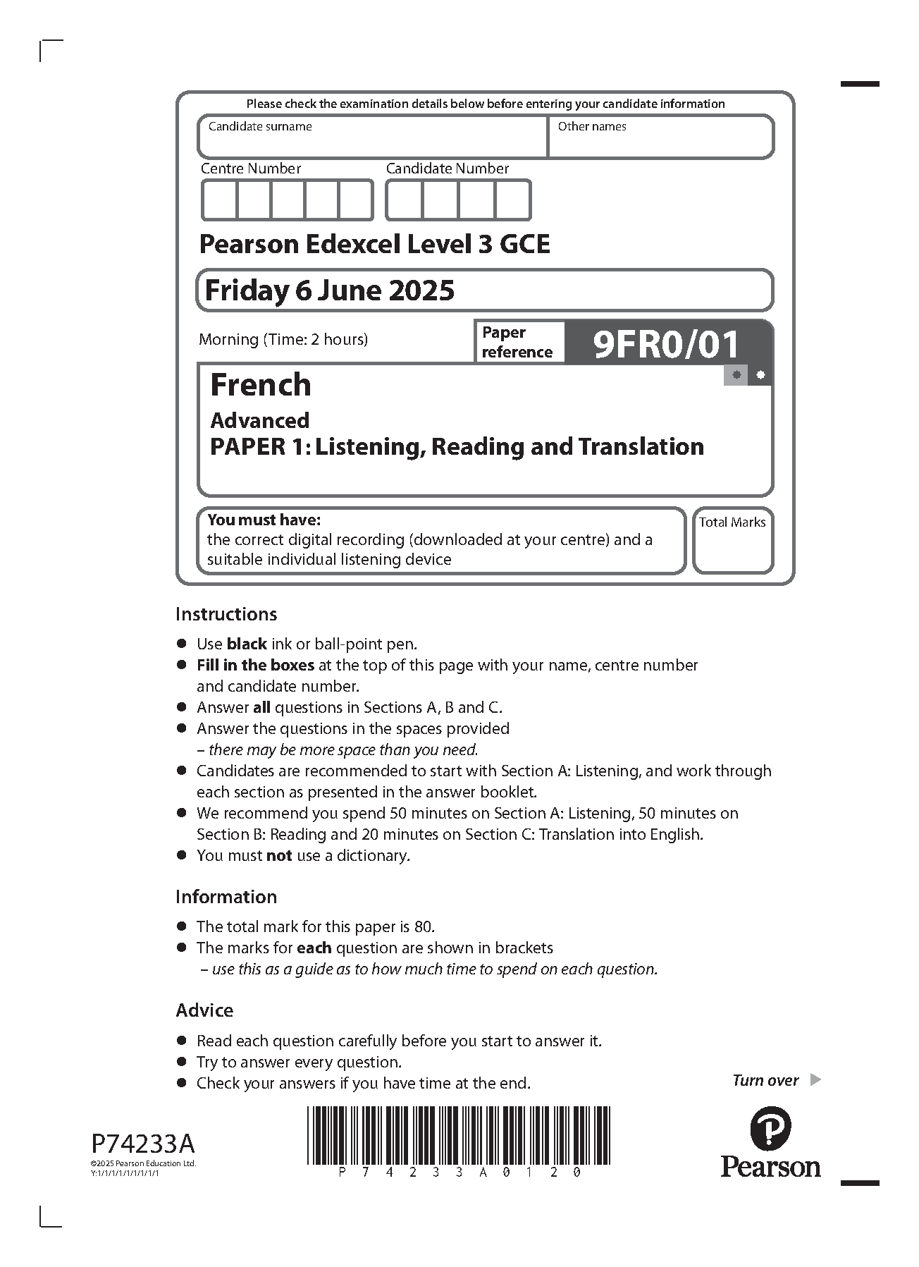 2025 Pearson Edexcel A Level French Paper 1 (9FR0/01: Listening, Reading and Translation)