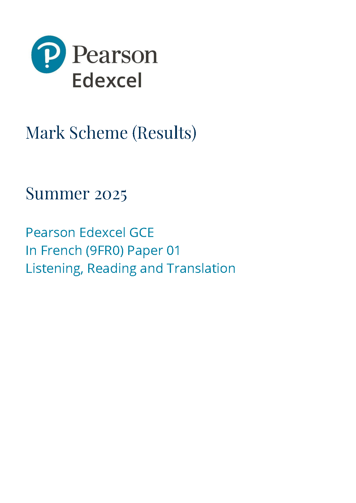 2025 Pearson Edexcel A Level French Mark Scheme Paper 1 (9FR0/01: Listening, Reading and Translation)